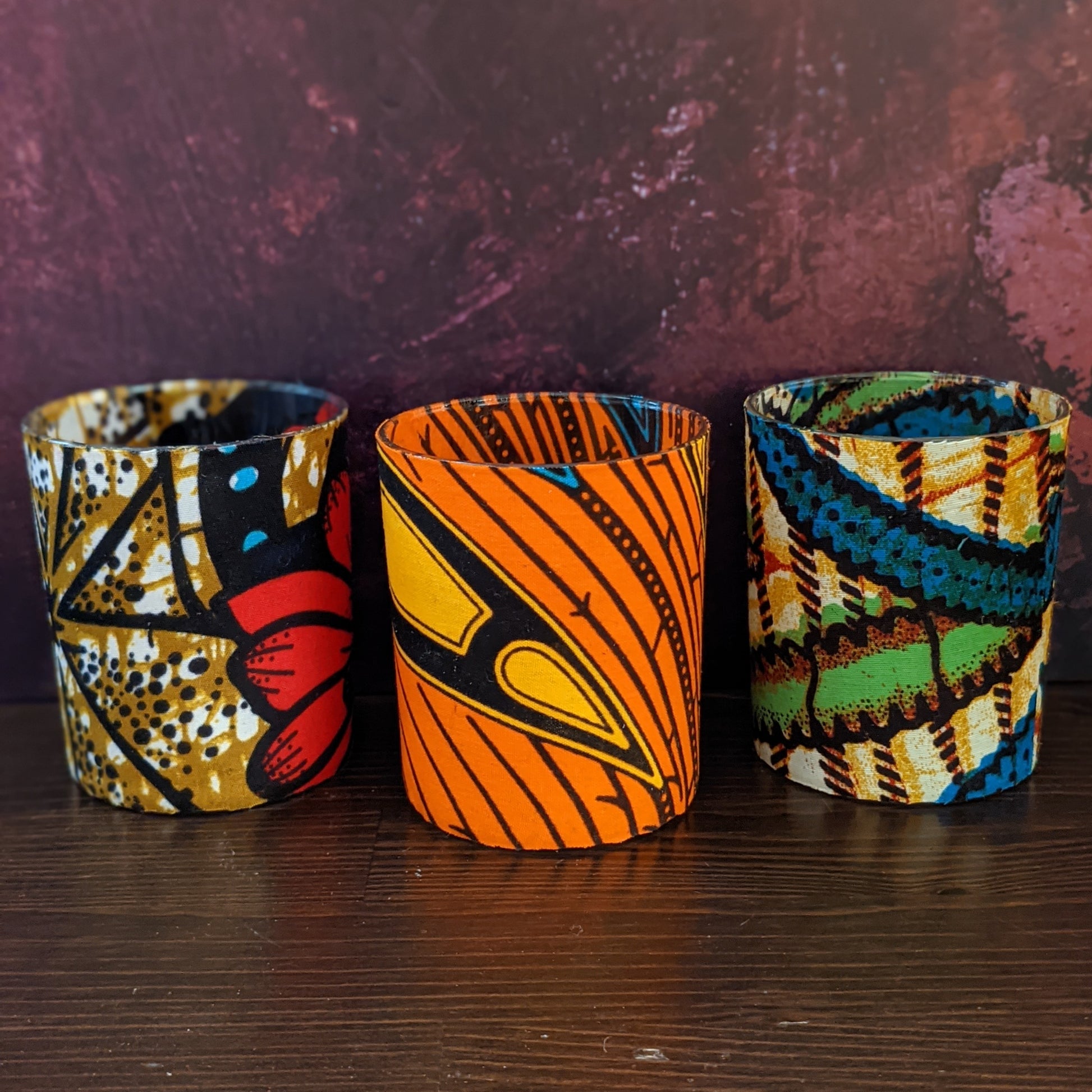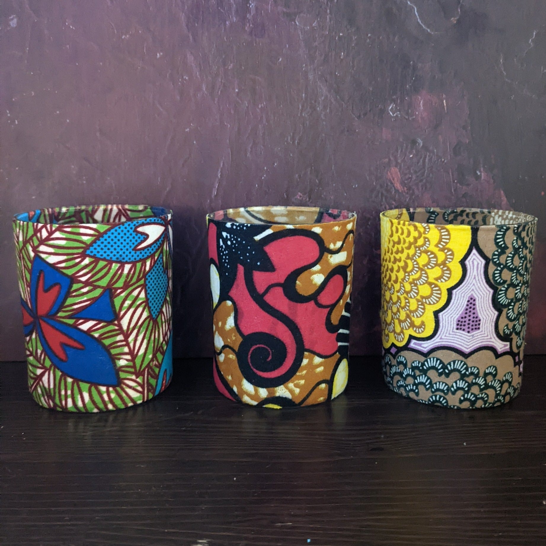 SET OF THREE mixed candle /tealight holders with mixed African print textiles. Great for a romantic dinner setting, party table decor, wedding party favour gift ideas etc.