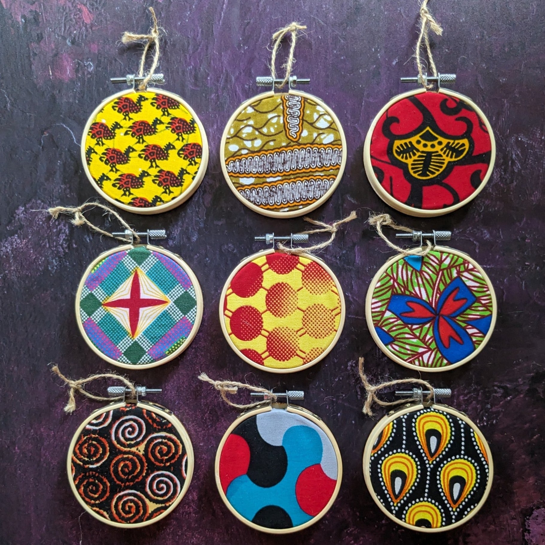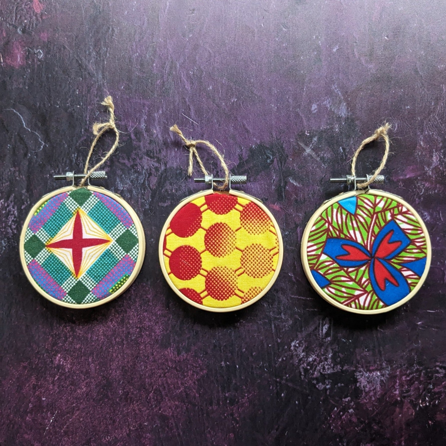 Vibrant African print embroidery hoop ornament set of three made with a mixed variety of fabric designs & colours.