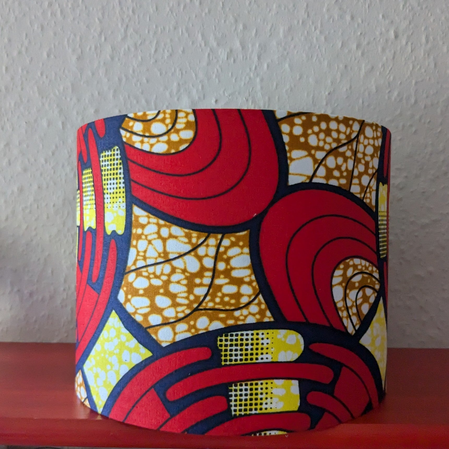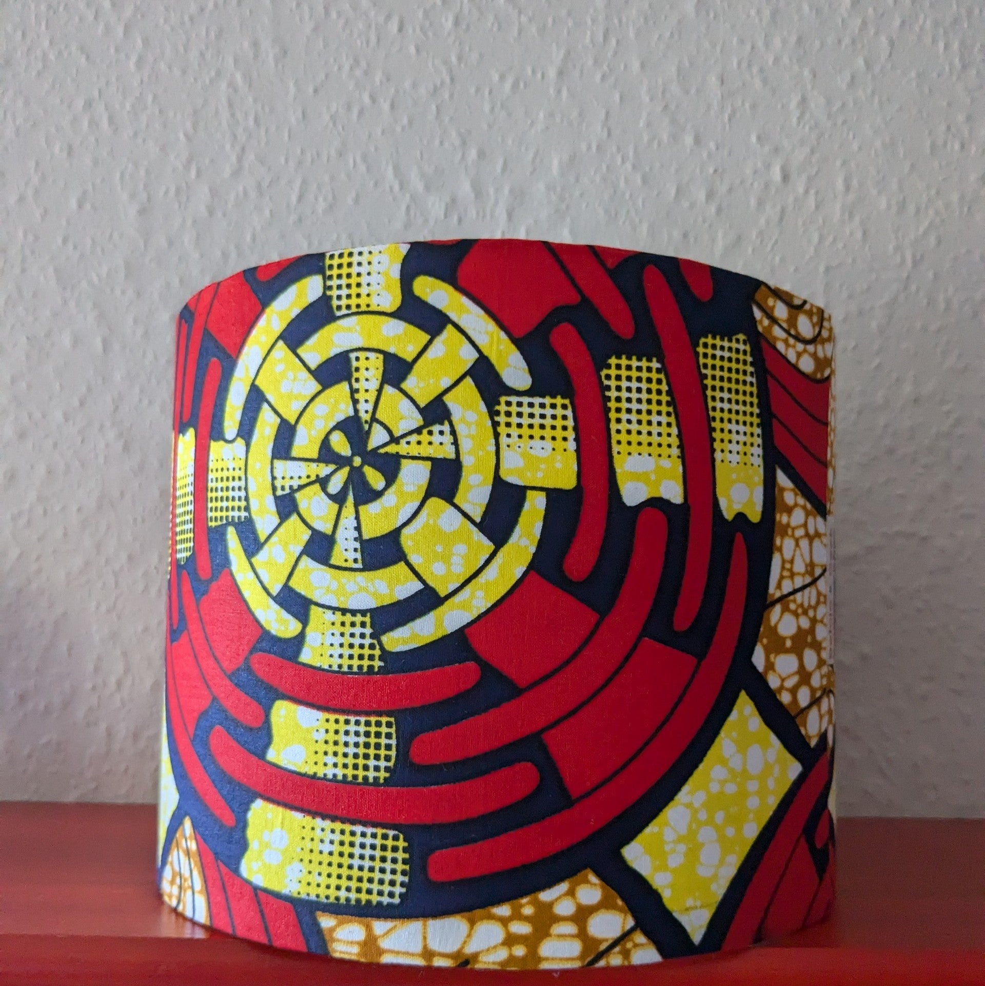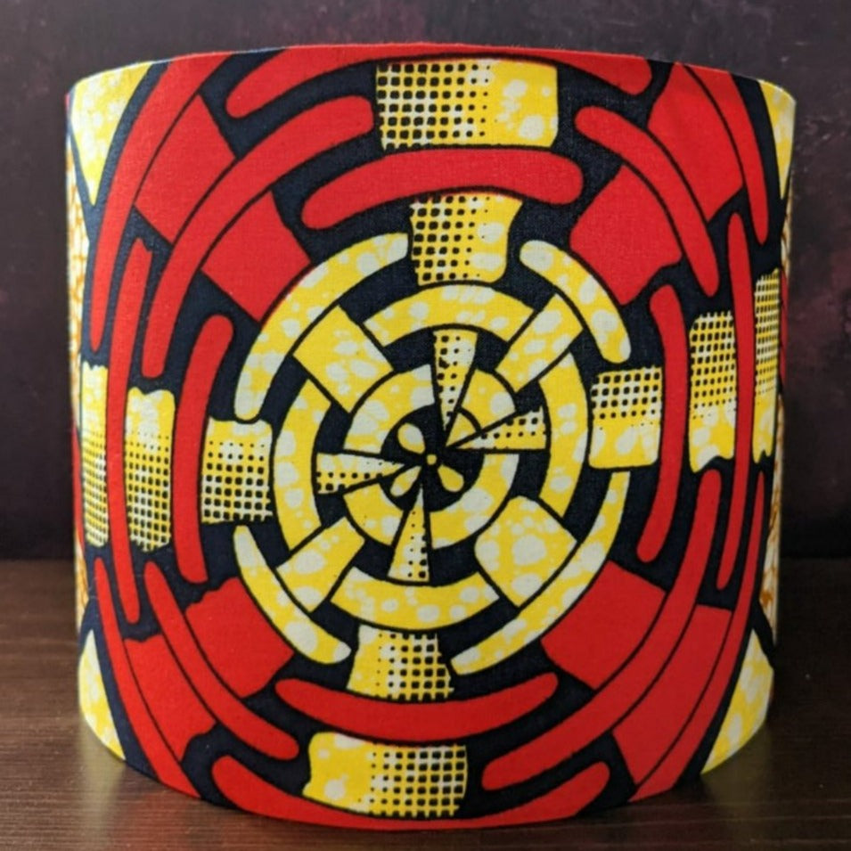 A bold patterned vibrant handmade lampshade in a red yellow African wax print fabric.