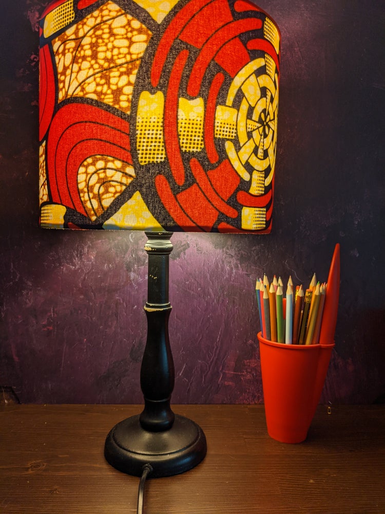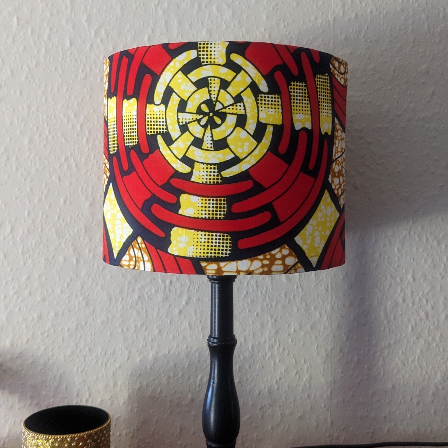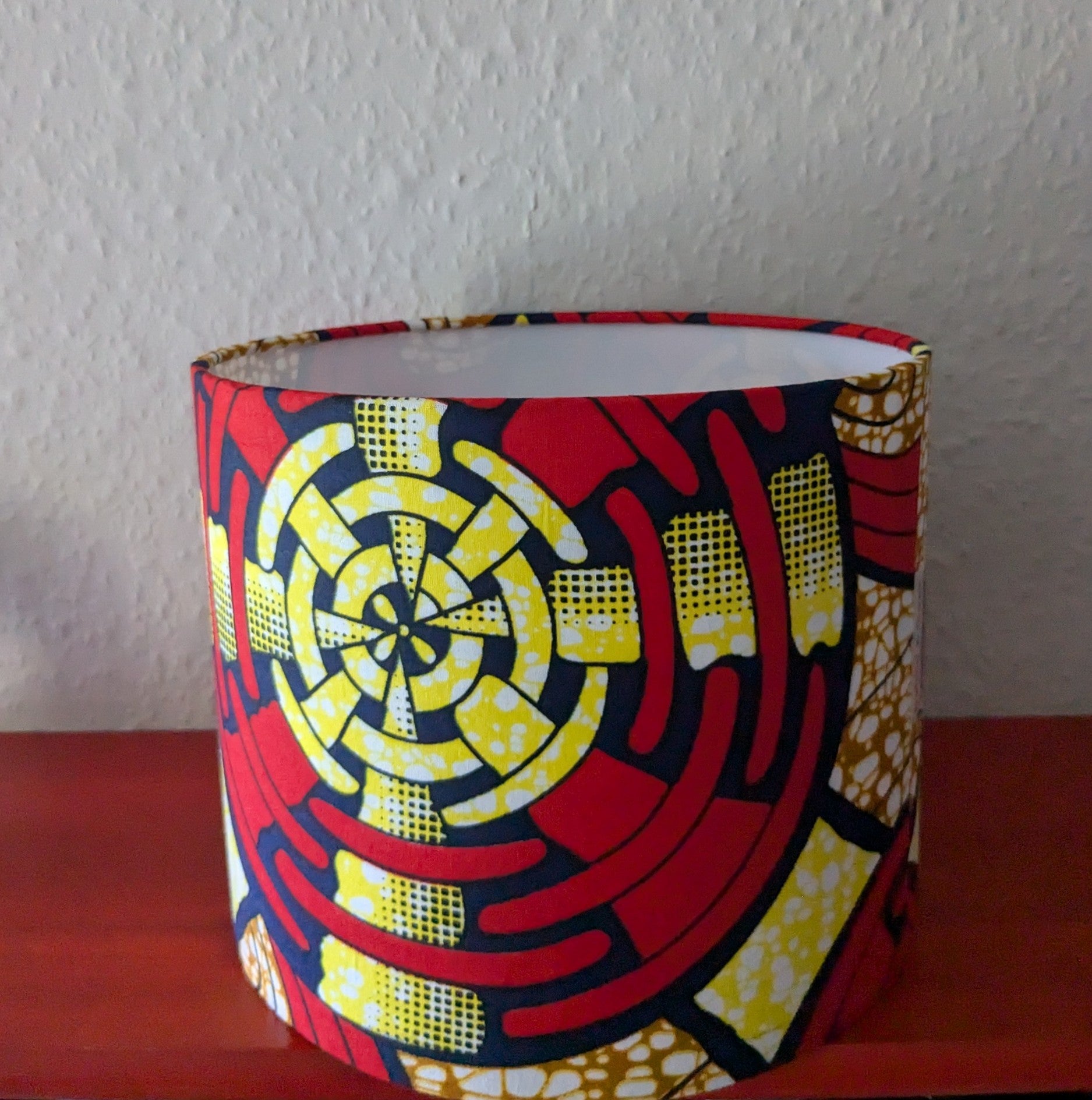 A bold patterned vibrant handmade lampshade in a red yellow African wax print fabric.