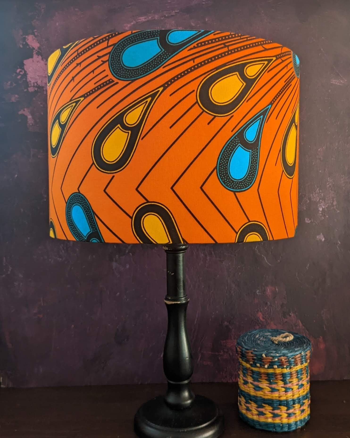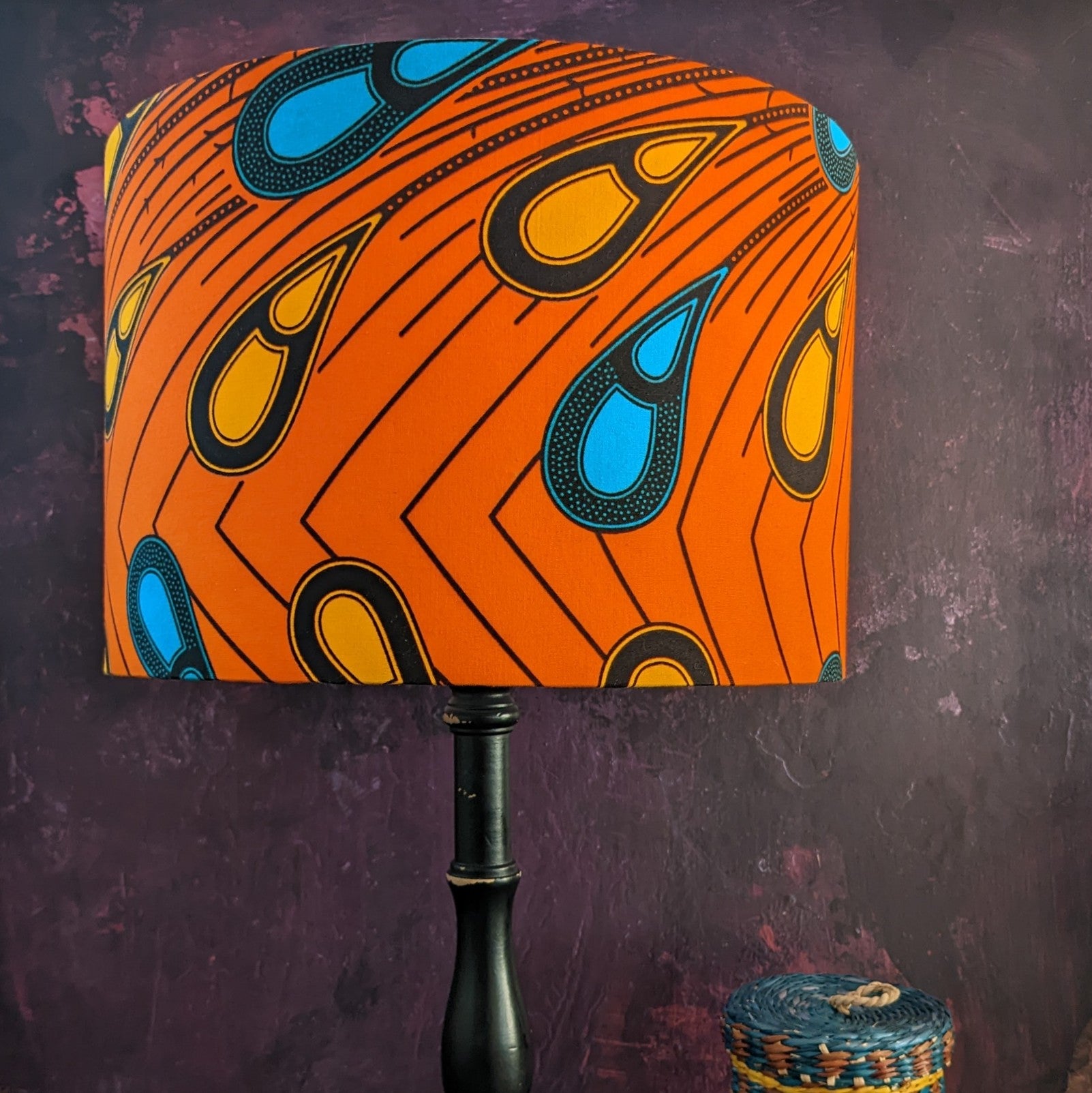 A vibrant animal inspired lampshade in a majestic peacock feathers African wax print fabric.