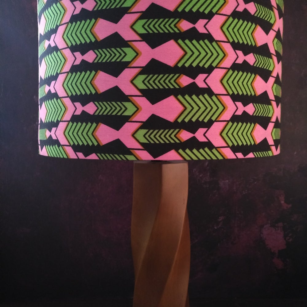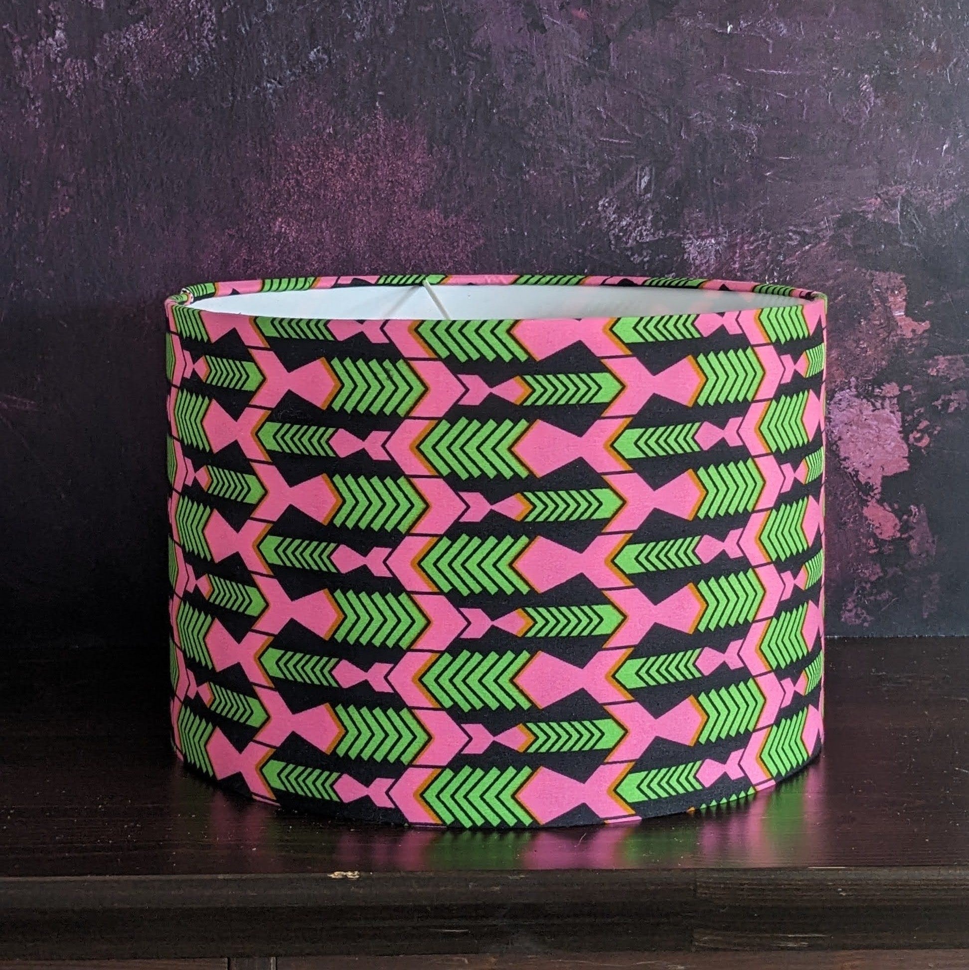 Handmade drum style lamp shade which is made in a colourful pink green & black African wax print fabric.
