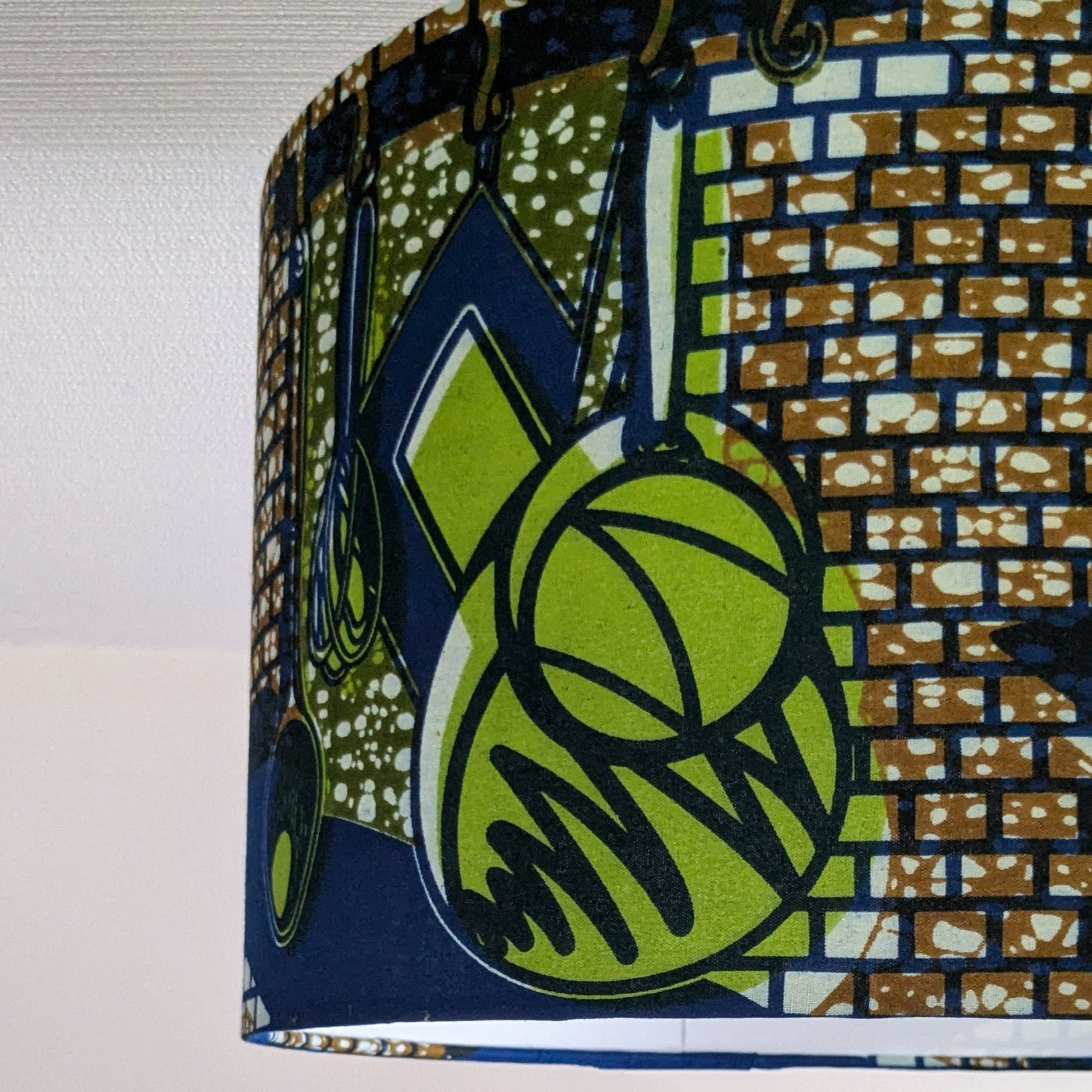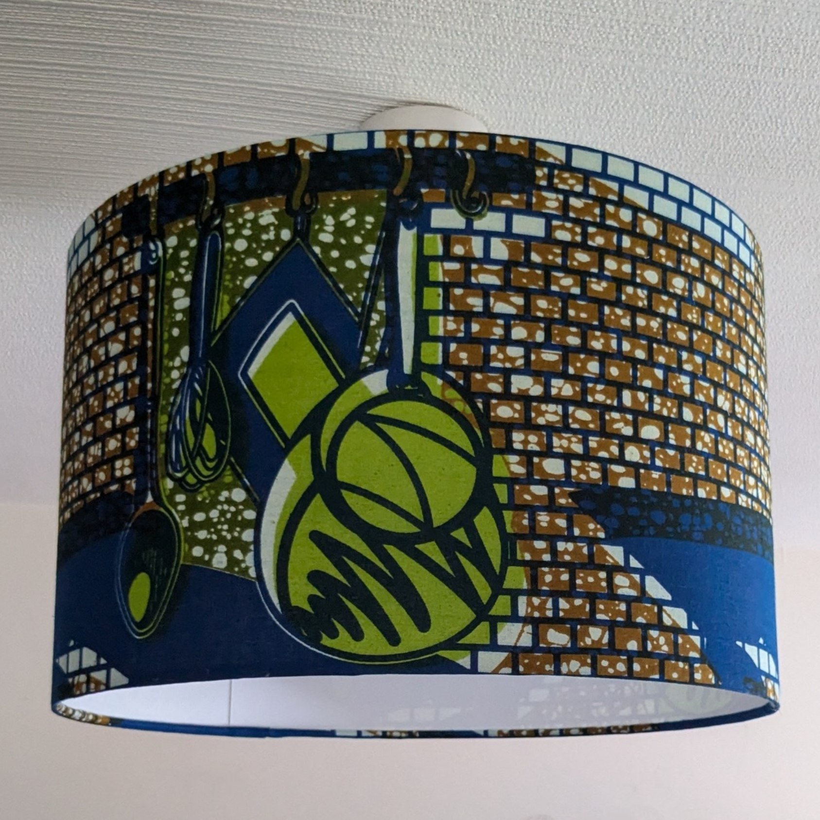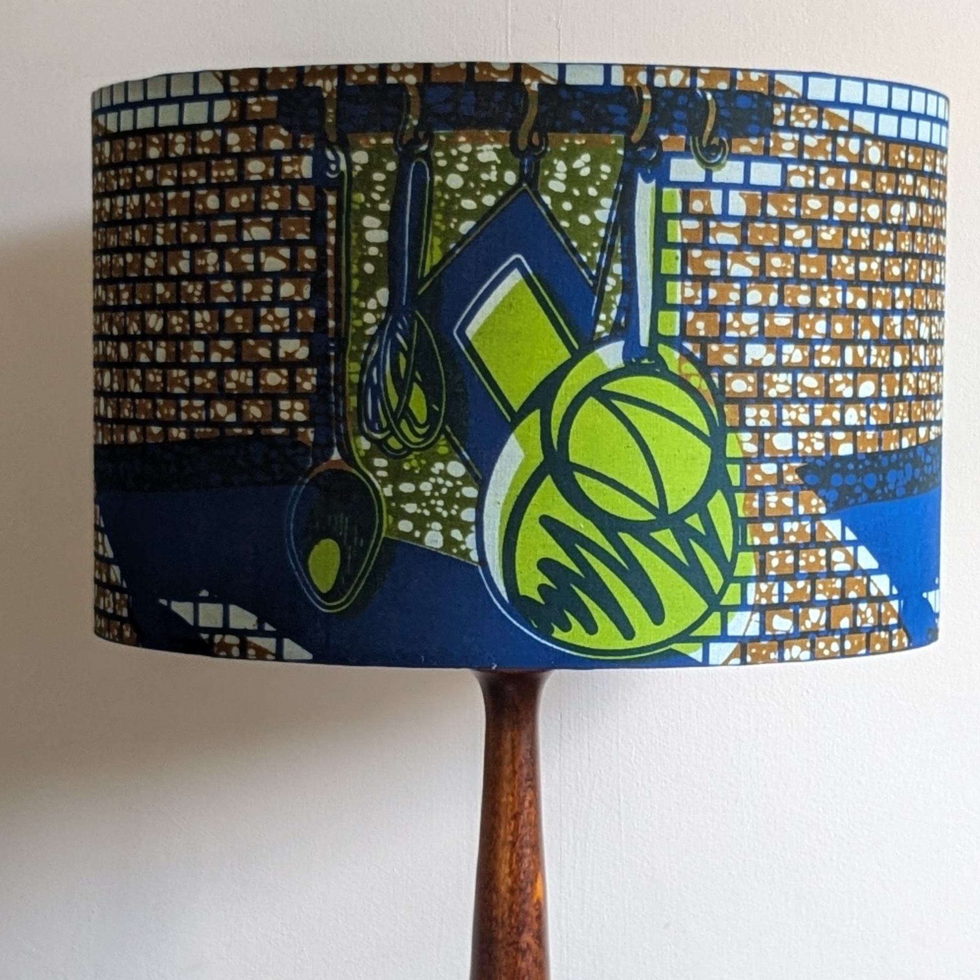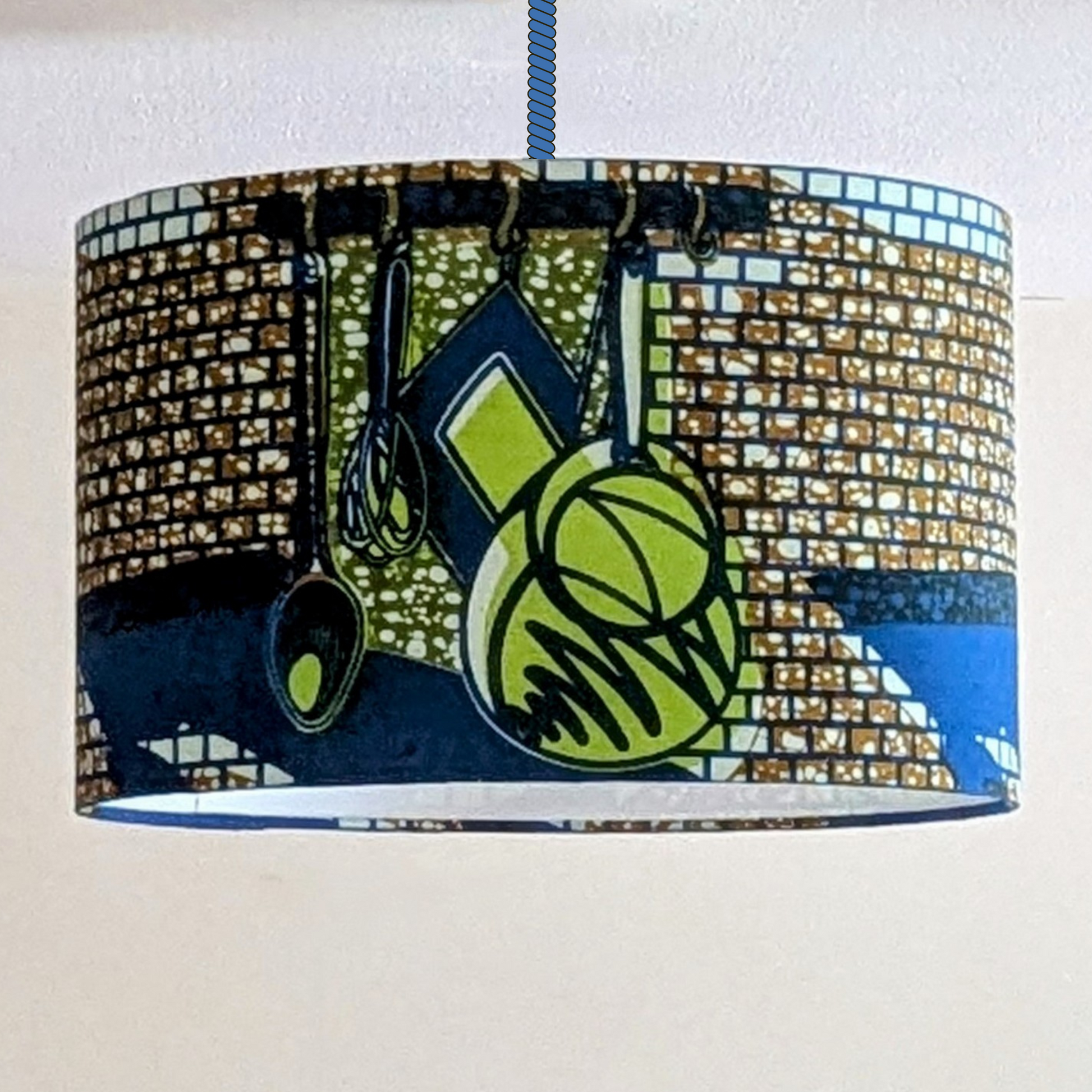 African Wax Print Lampshade SONJE: Green Blue Kitchen Utensils Pattern