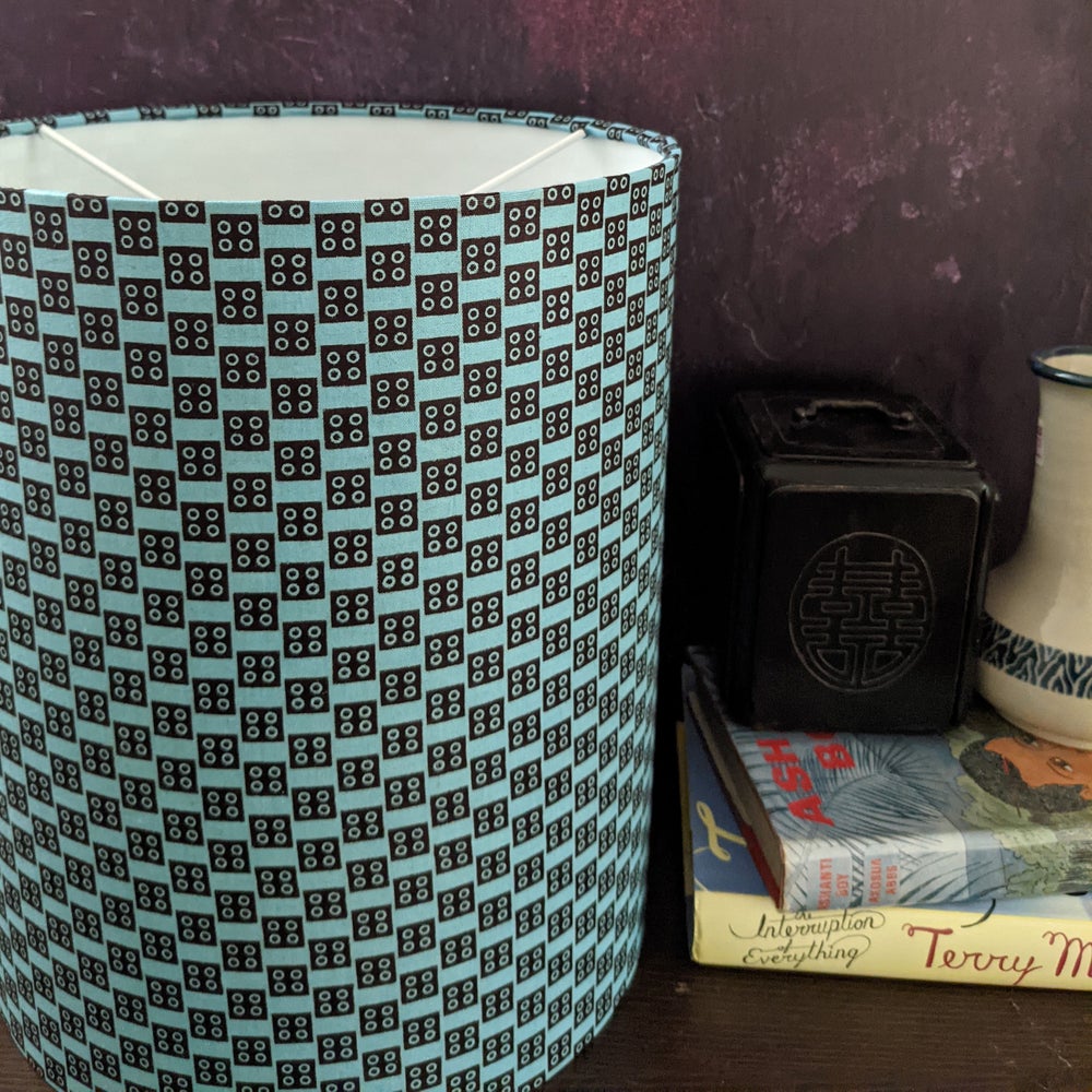 Tall African wax print lampshade in a a sky blue & dark brown colourway. The design features geometric game dice.