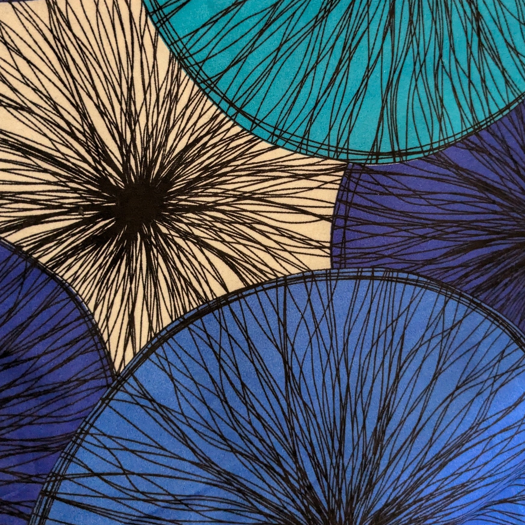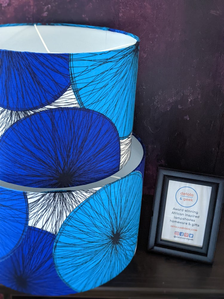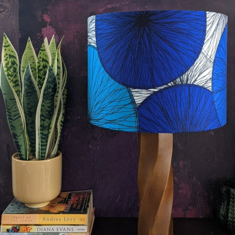 A stunning large patterned lampshade with shades of blue geometric circles. It is full of Mid century vibes for sure