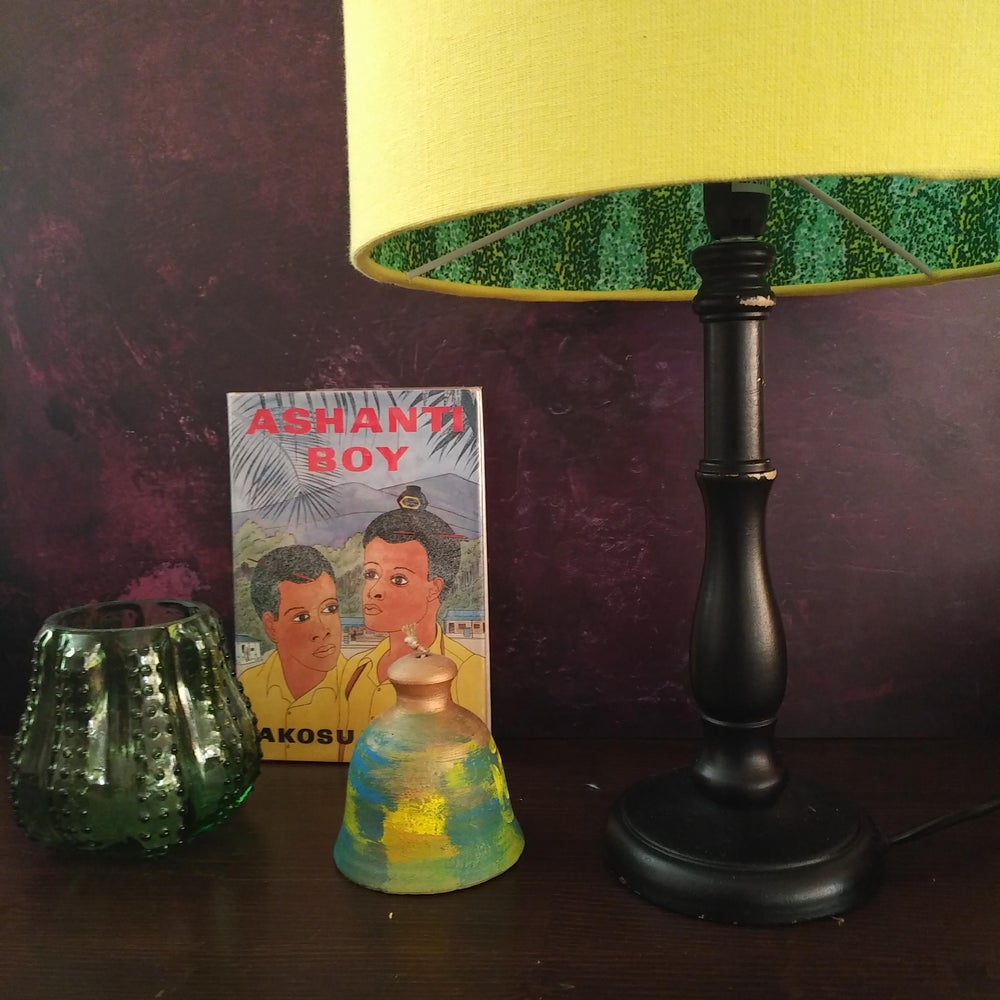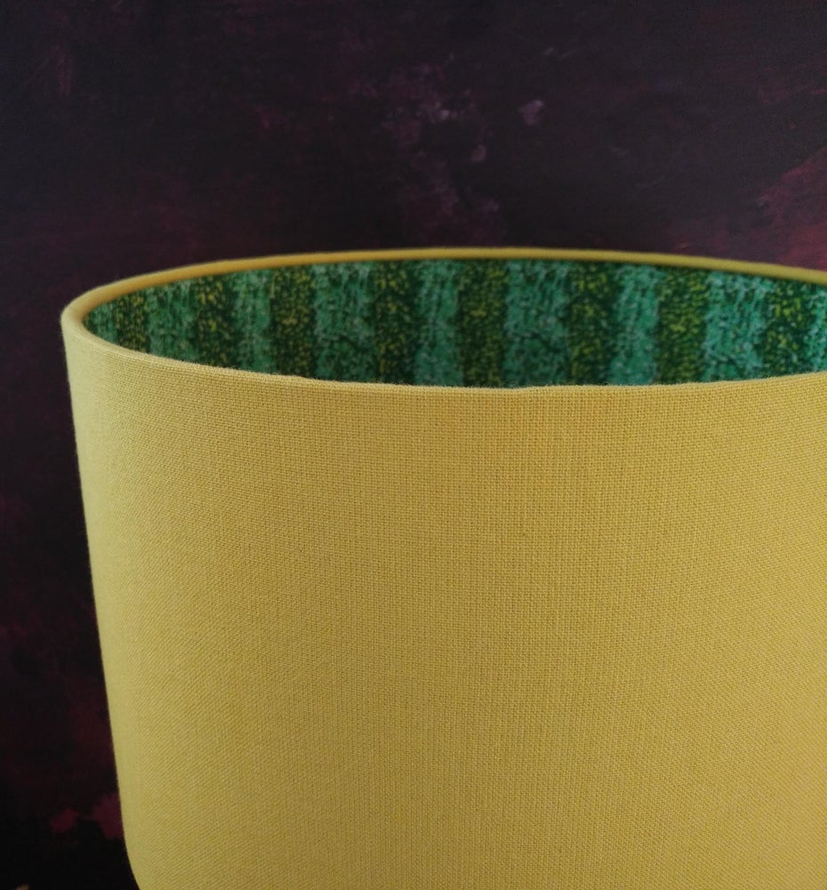 It's lined with a green hedge grass patterned African print fabric with a solid yellow fabric on the outside. See 5th image to see the light shade with the light switched on. To appreciate this patterned lined lampshade fully - I recommend you use it as a ceiling pendant. It can also be paired with a lamp base too.