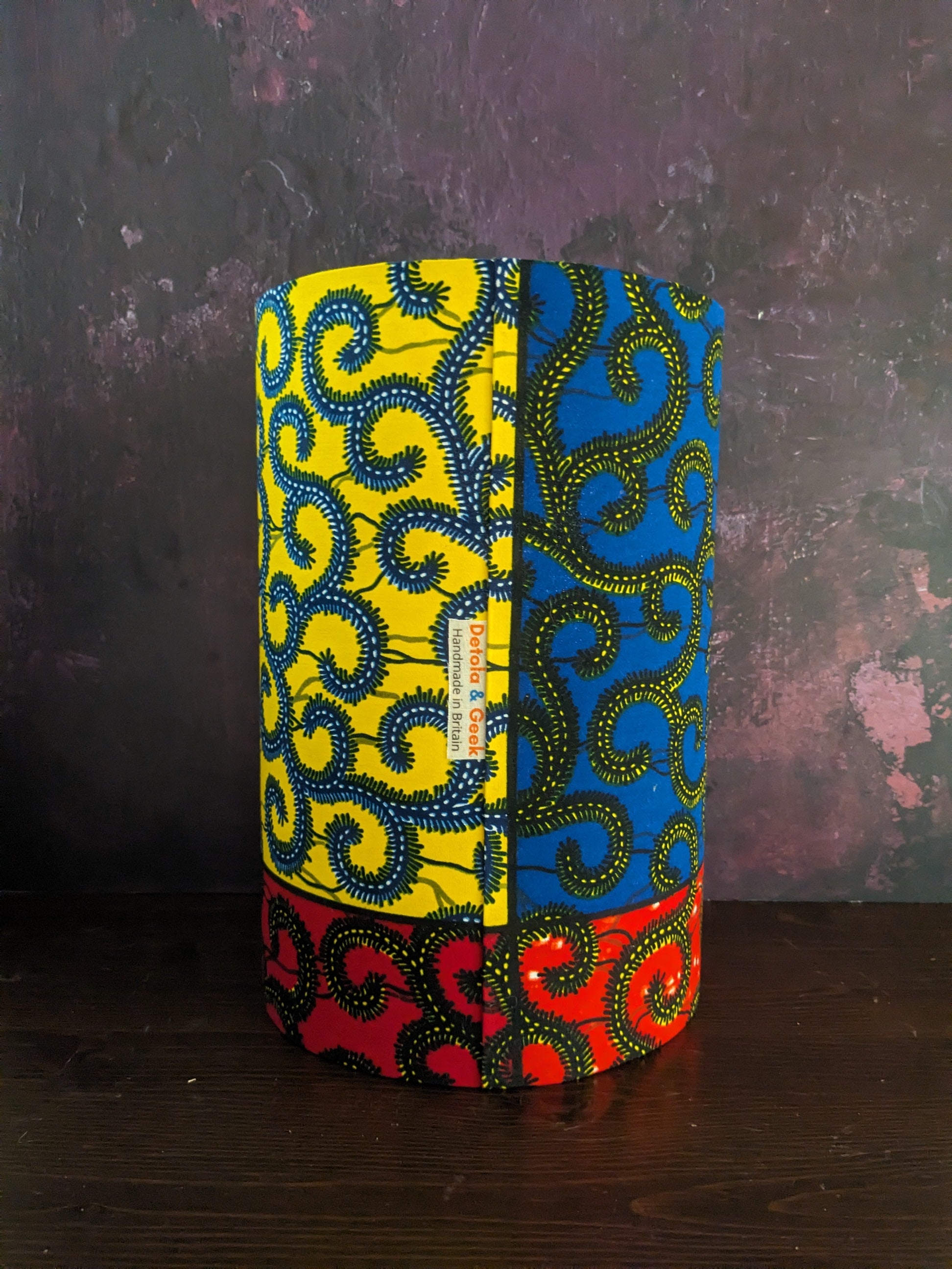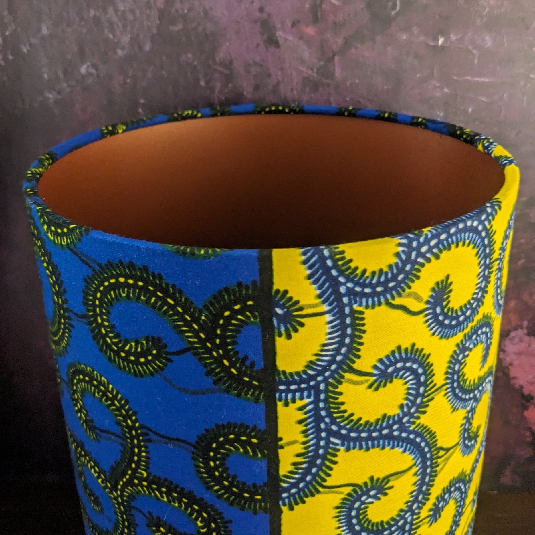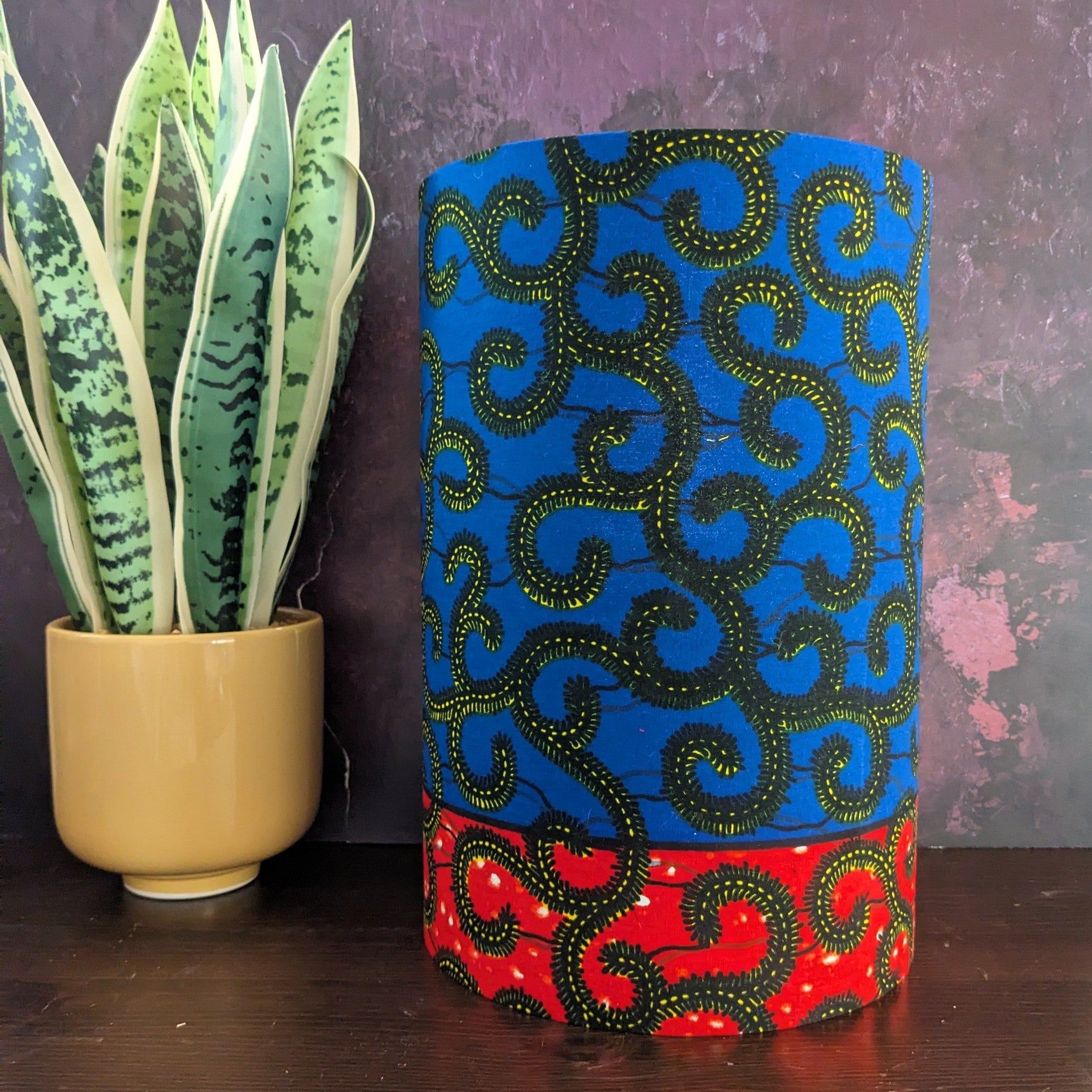 A colourful botanical plant vine patterned handmade lampshade made in a blue red & yellow African wax print fabric.