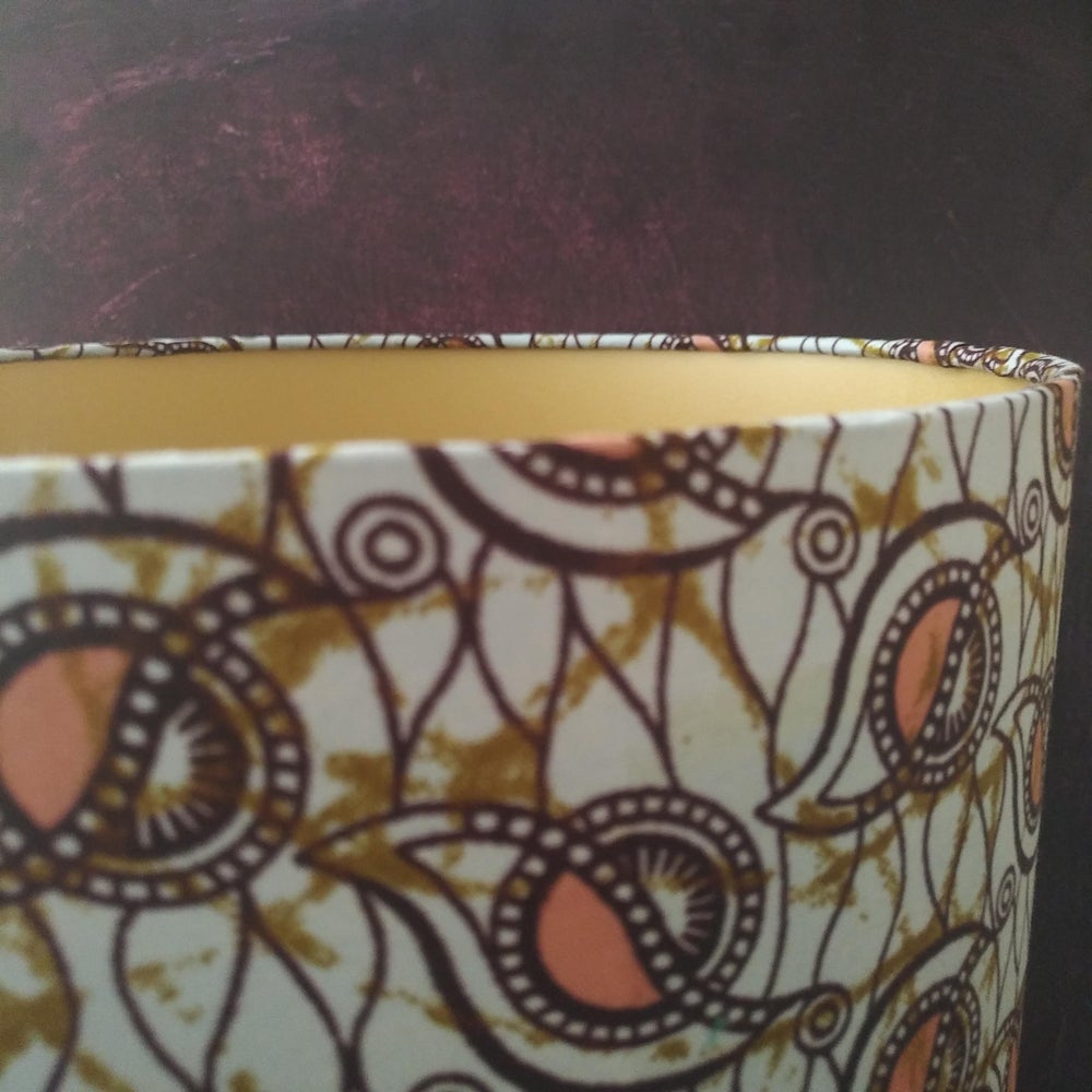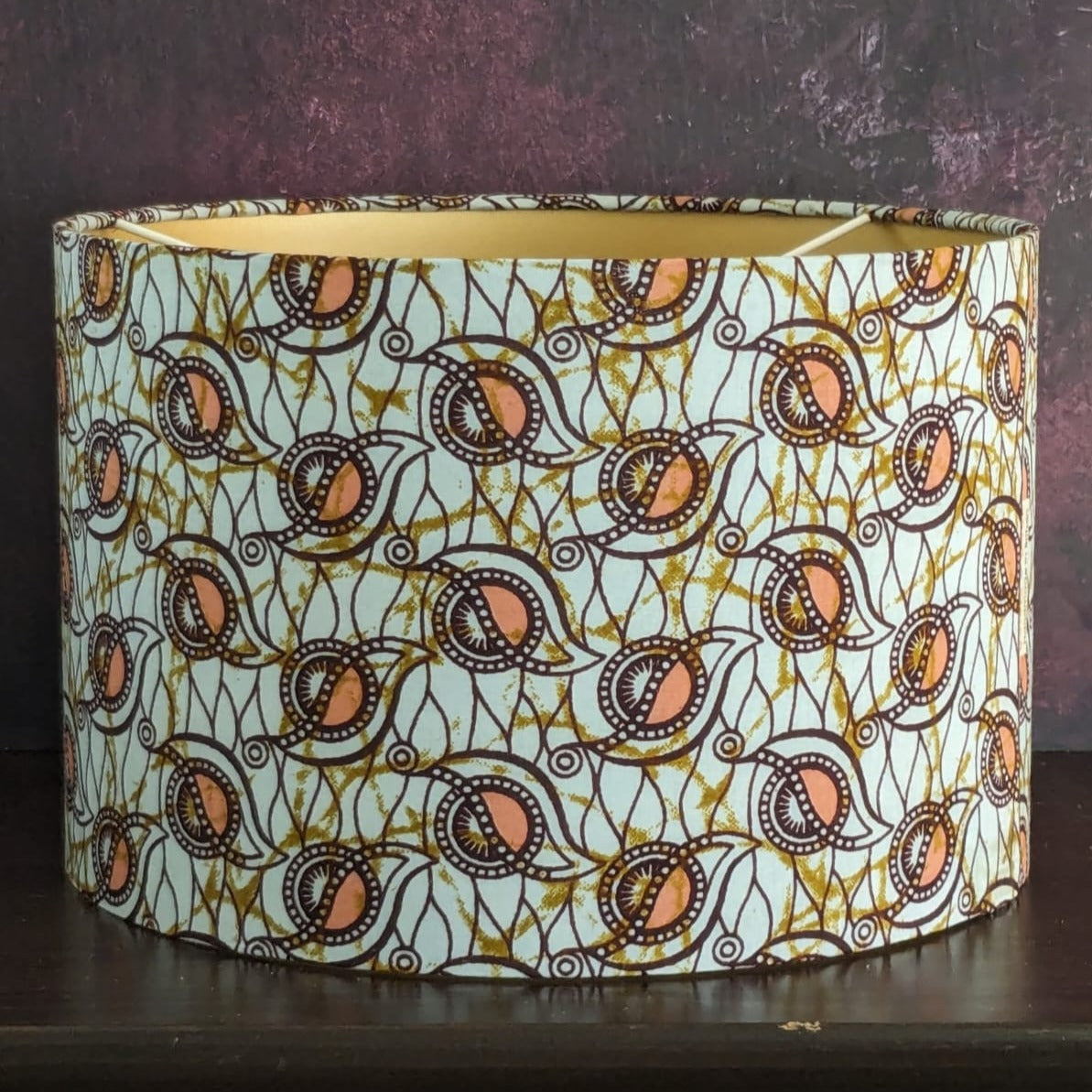 A cool patterned African lampshade in an ecru colourway. It is patterned with small brown & coral eyes with dashes of gold streaks.