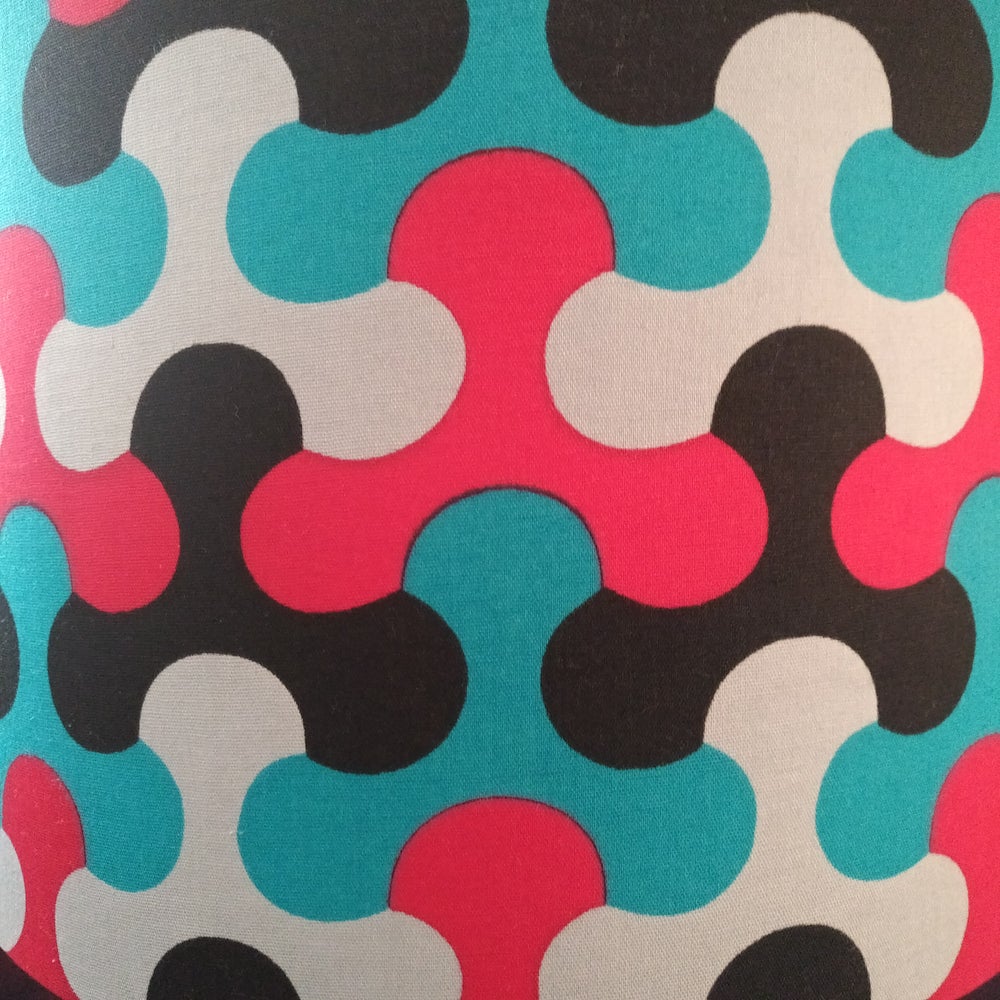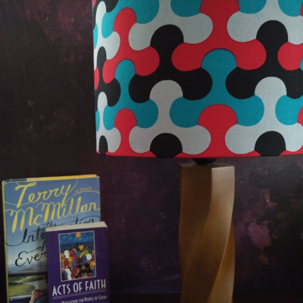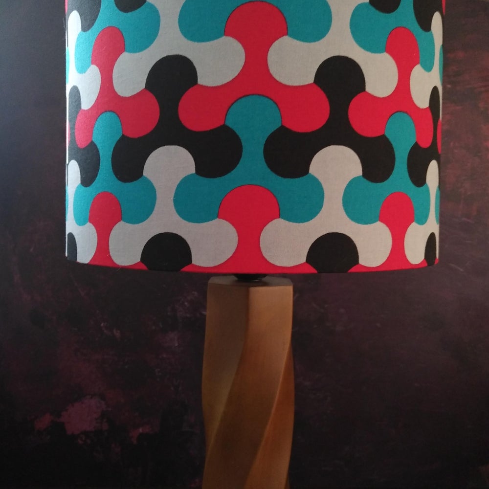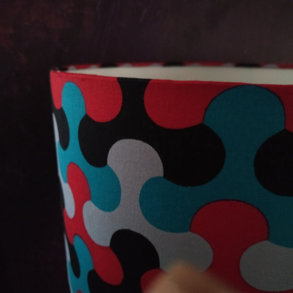 Handmade lampshade made in a colourful African wax print fabric mimicking a jigsaw puzzle.