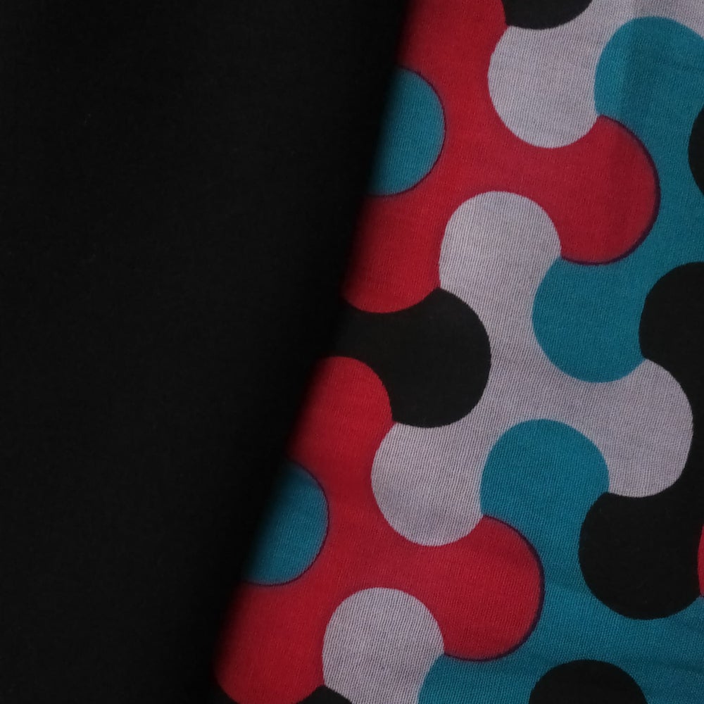 Black double-lined drum lampshade offset with a complimenting bold & colourful geometric jigsaw puzzle pattern on the inside.