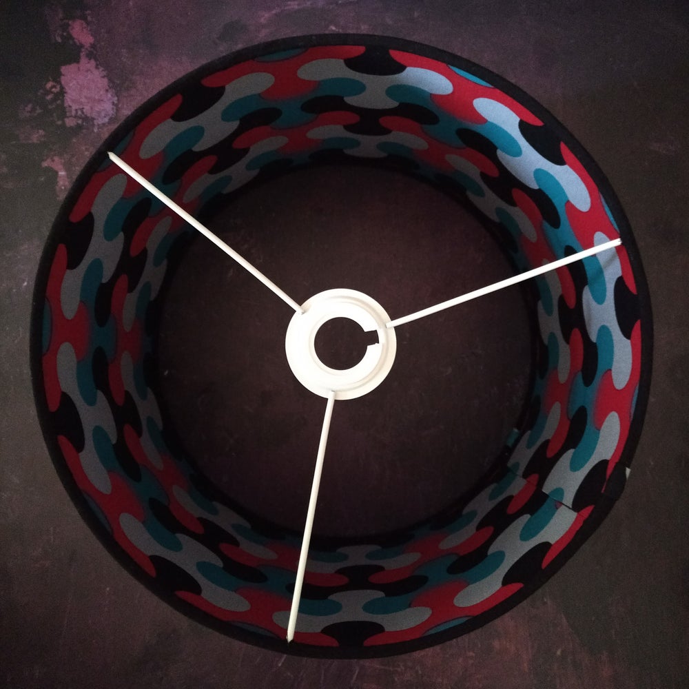 It's lined with a popping red turquoise & black geometric patterned African print fabric with a plain black fabric on the outside. To appreciate this patterned lined lampshade fully - I recommend you use it as a ceiling pendant. It can also be paired with a lamp base too as it is a non-directional print on the inside.