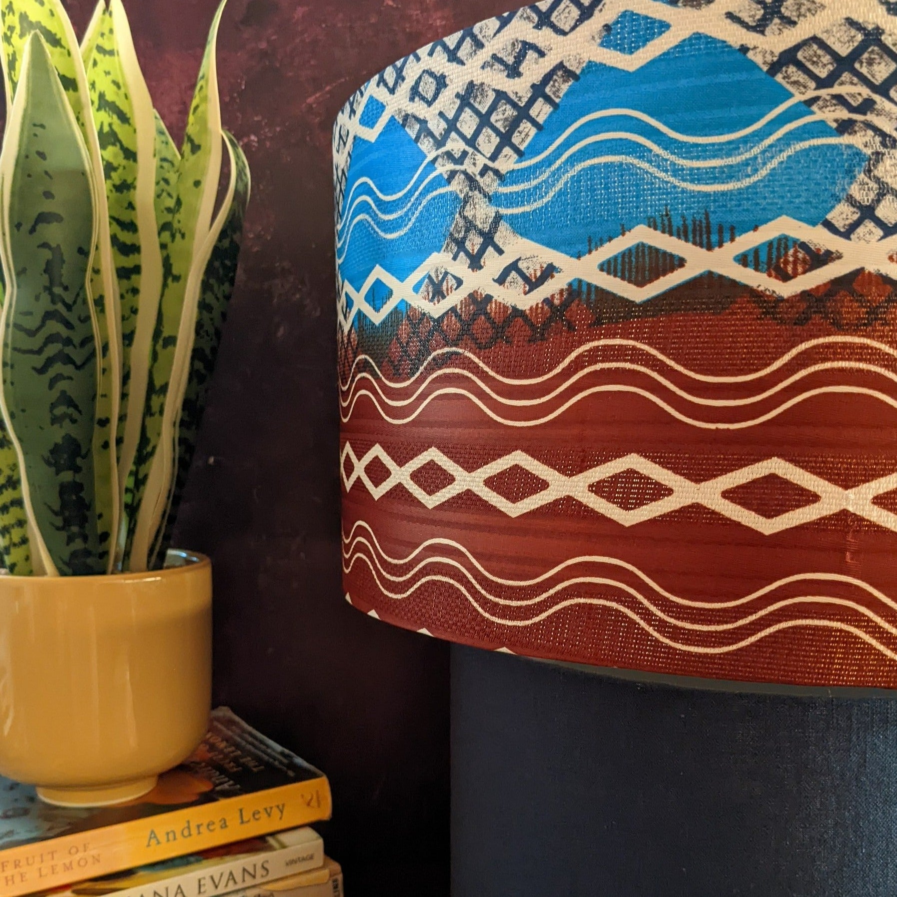 This is a beautiful extra large Afro luxe two tiered drum ceiling lampshade made with a fusion of African heritage & western vibes. This limited edition oversized lampshade is a show stopper & will make a dramatic statement wherever it's placed.