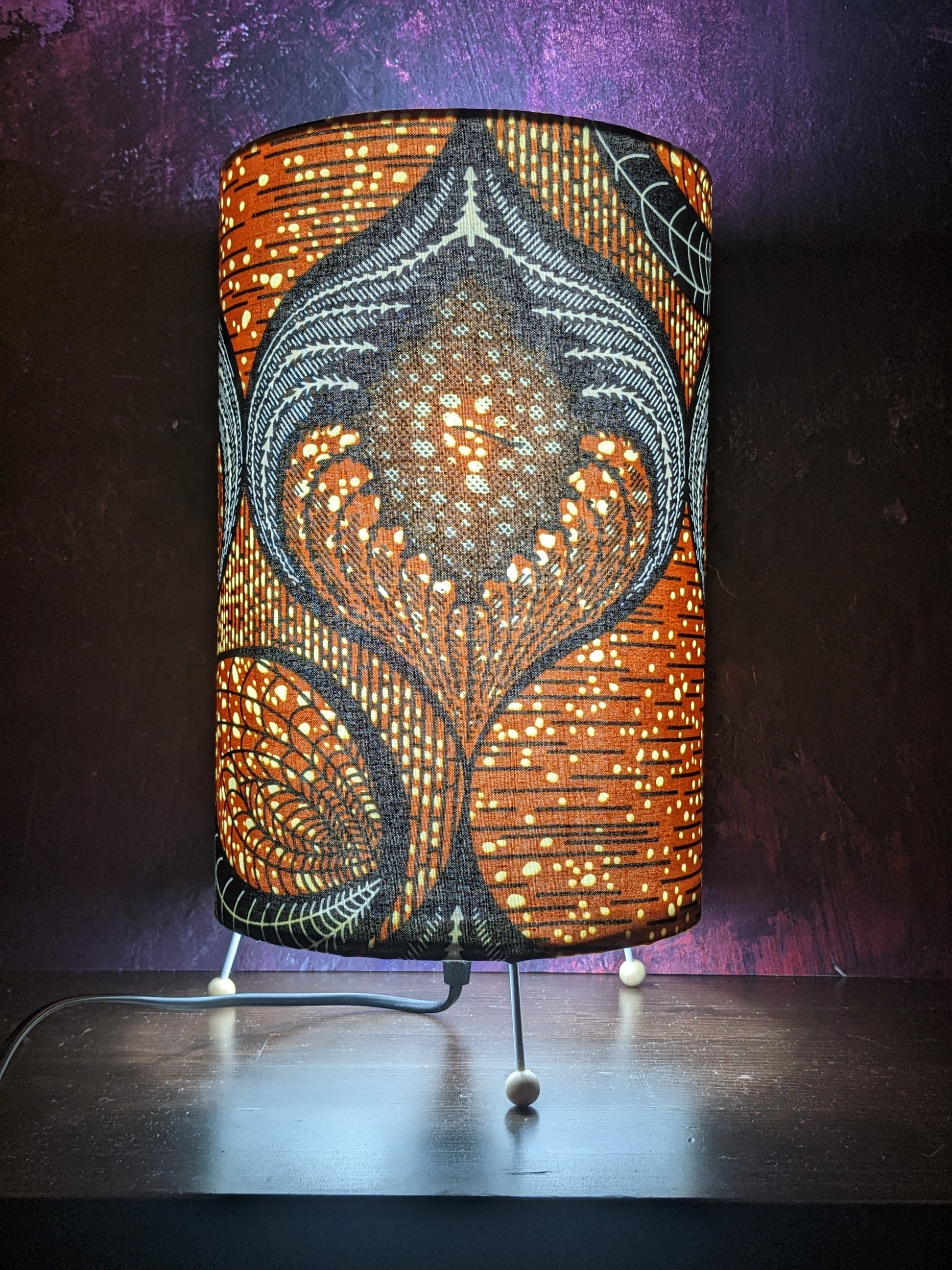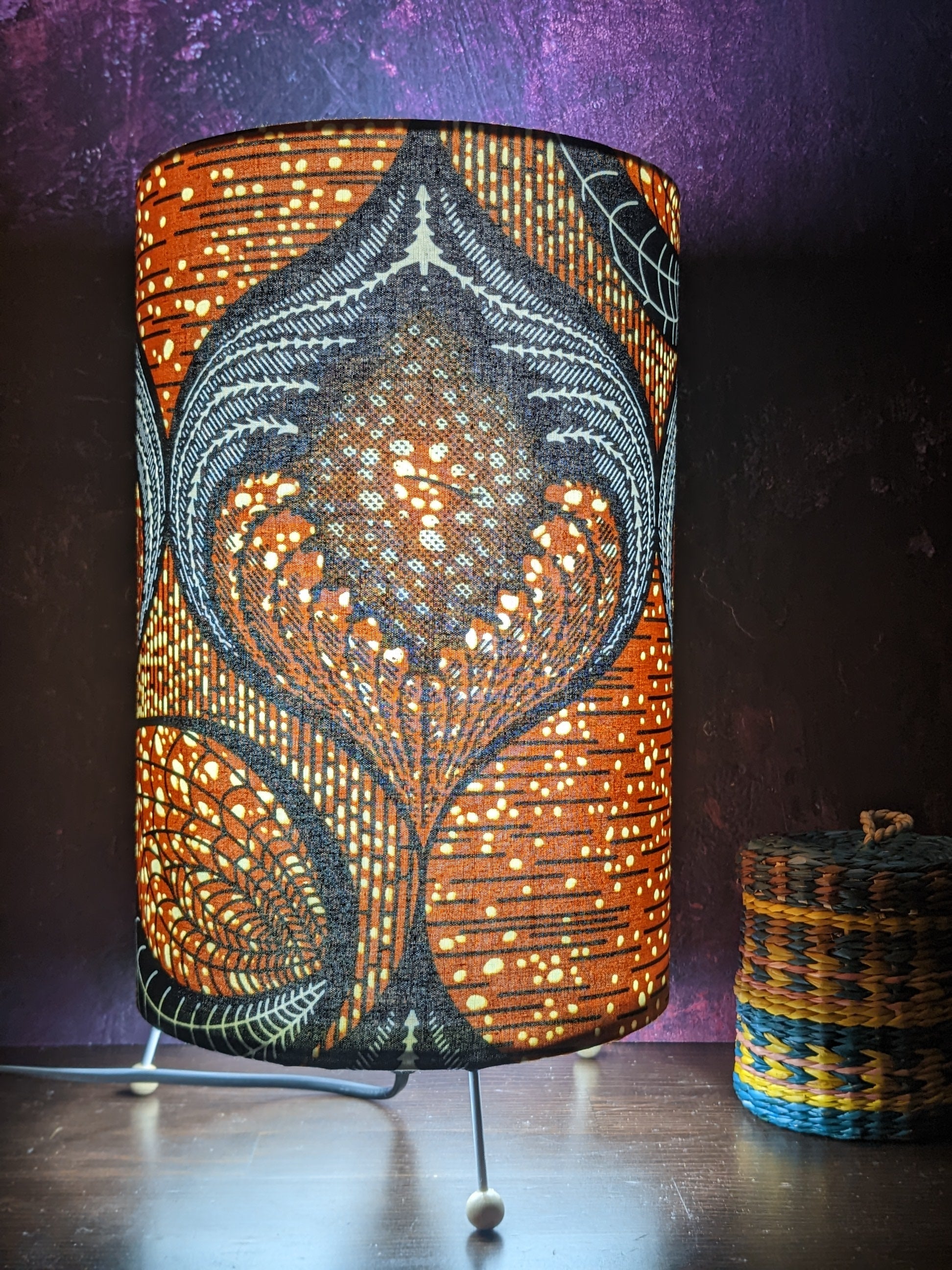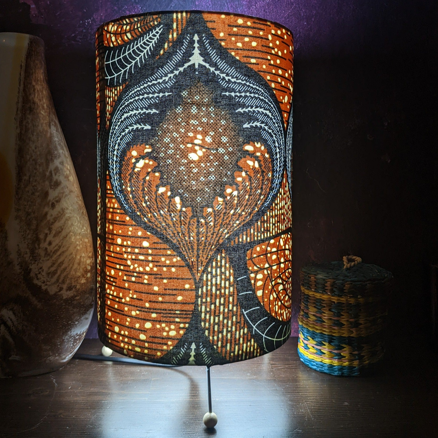 A brown & blue African wax print lamp shade with a large Christmas bauble decoration pattern.