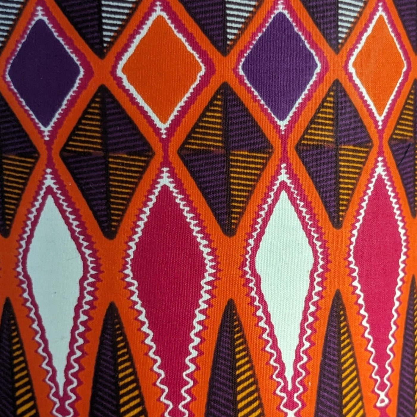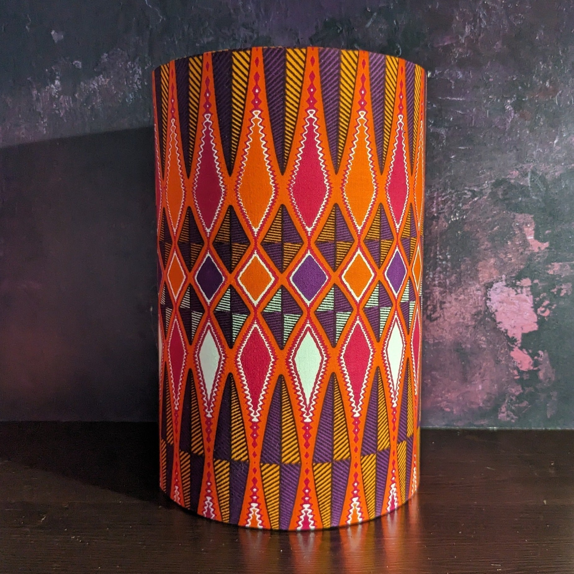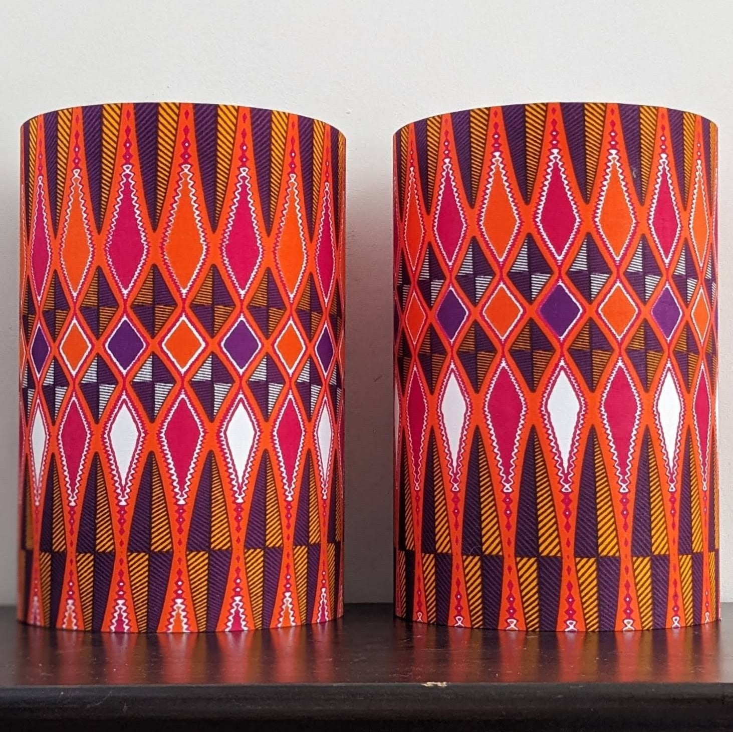 A pair of colourful geometric lampshades made with a tribal Aztec inspired African wax print fabric.