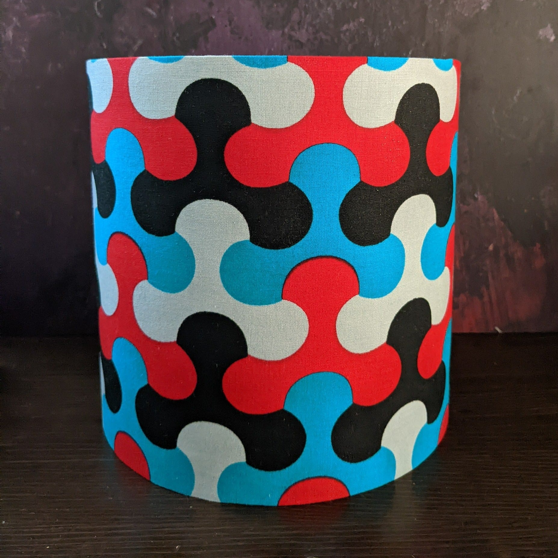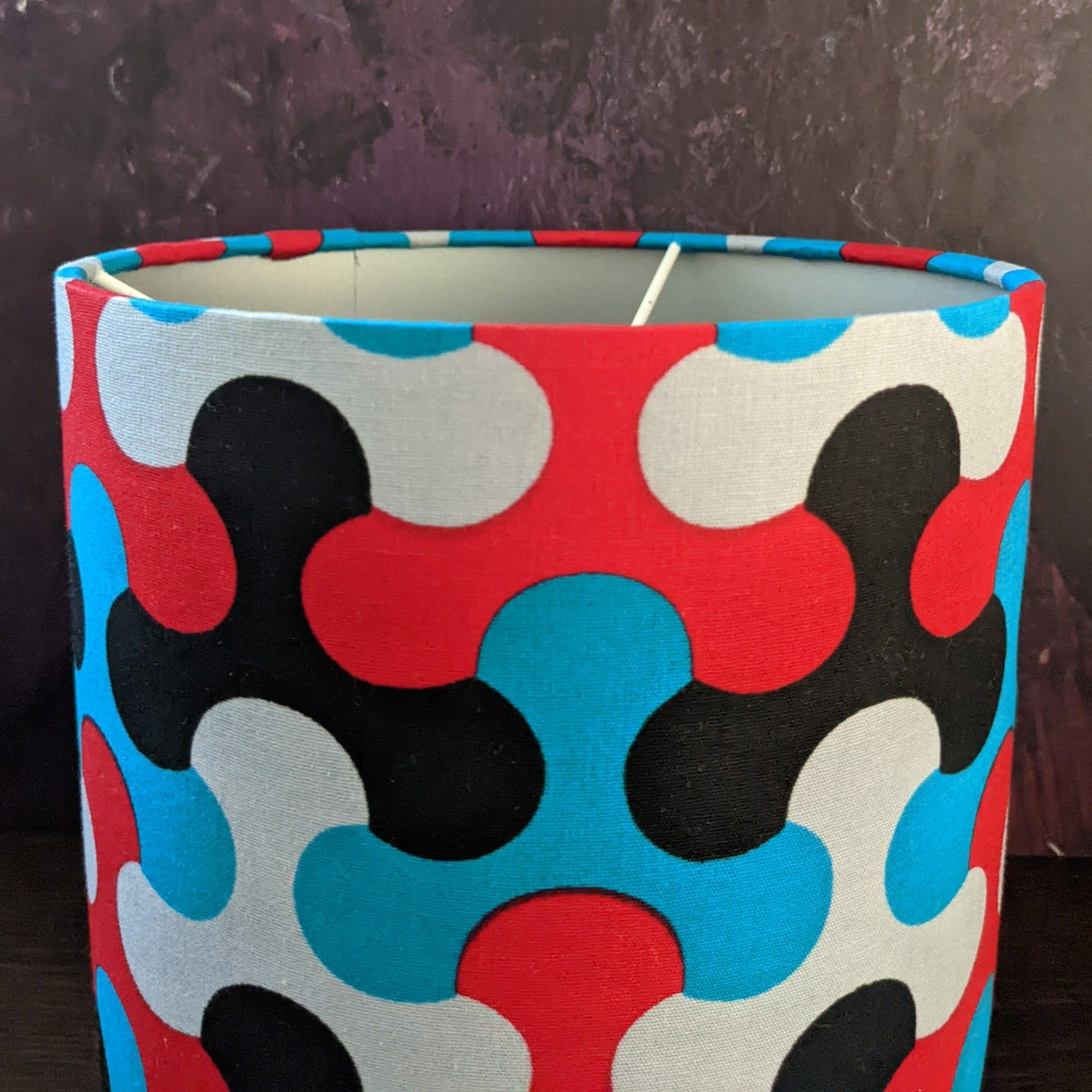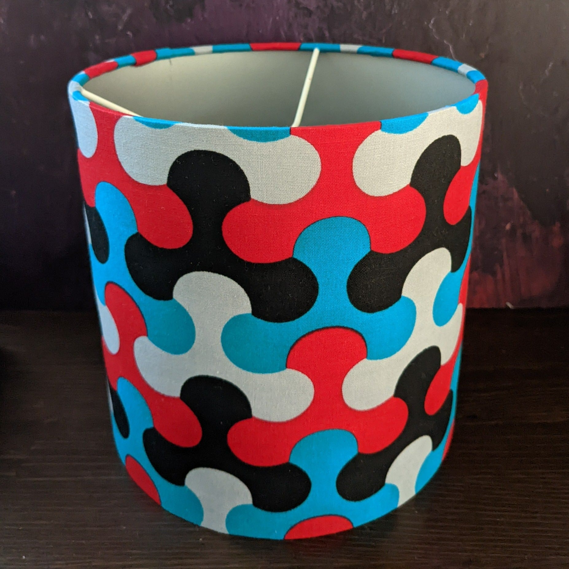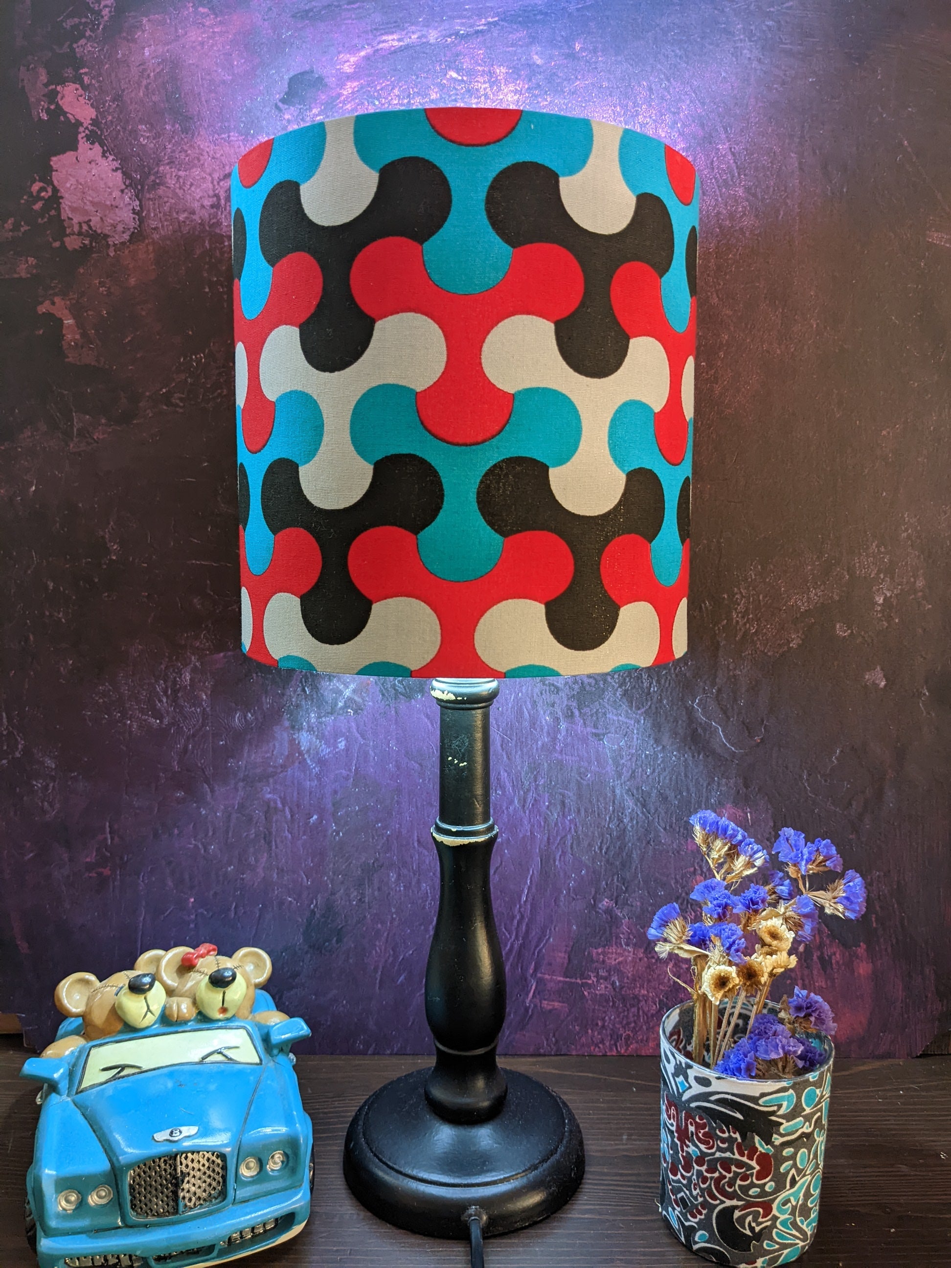 A cute African print handmade lampshade made in a colourful jigsaw puzzle retro design.