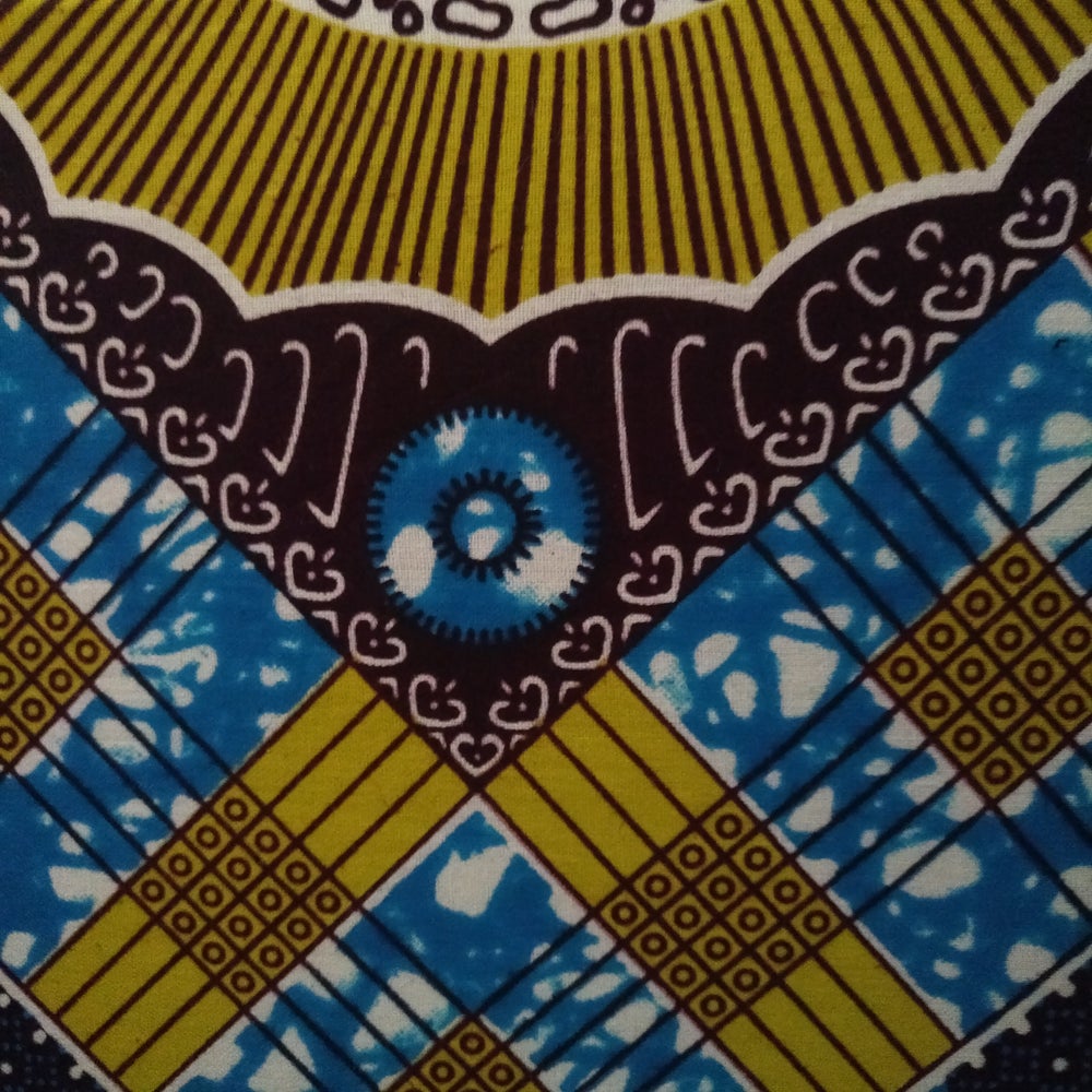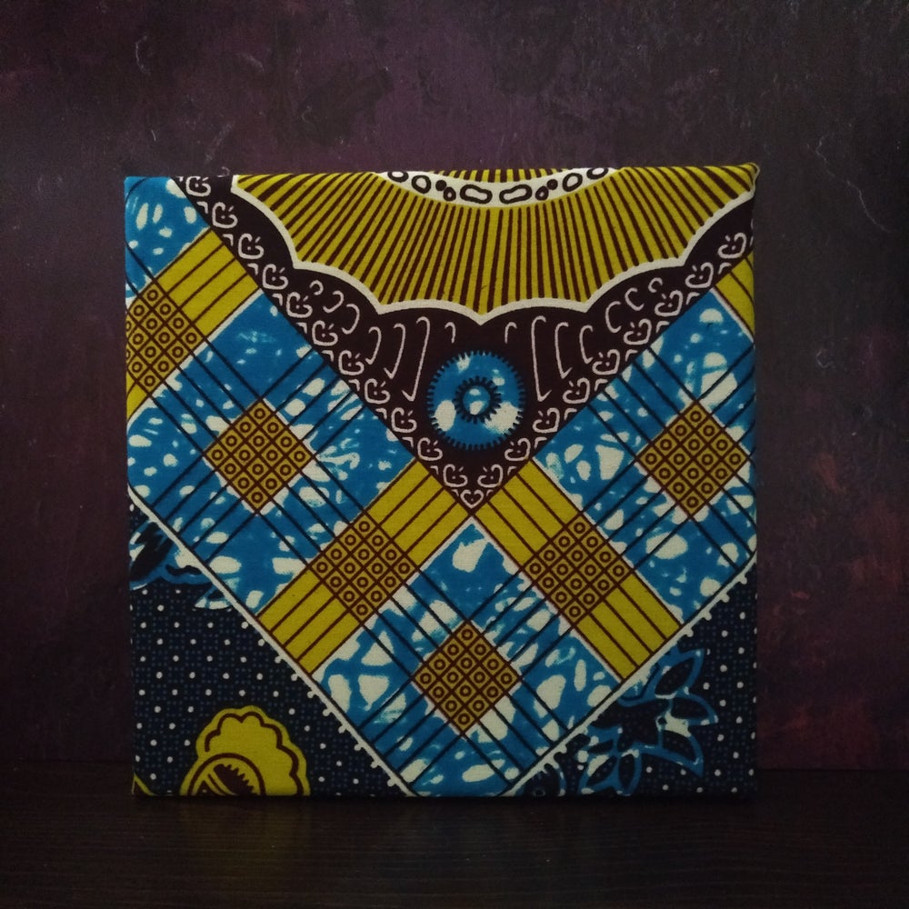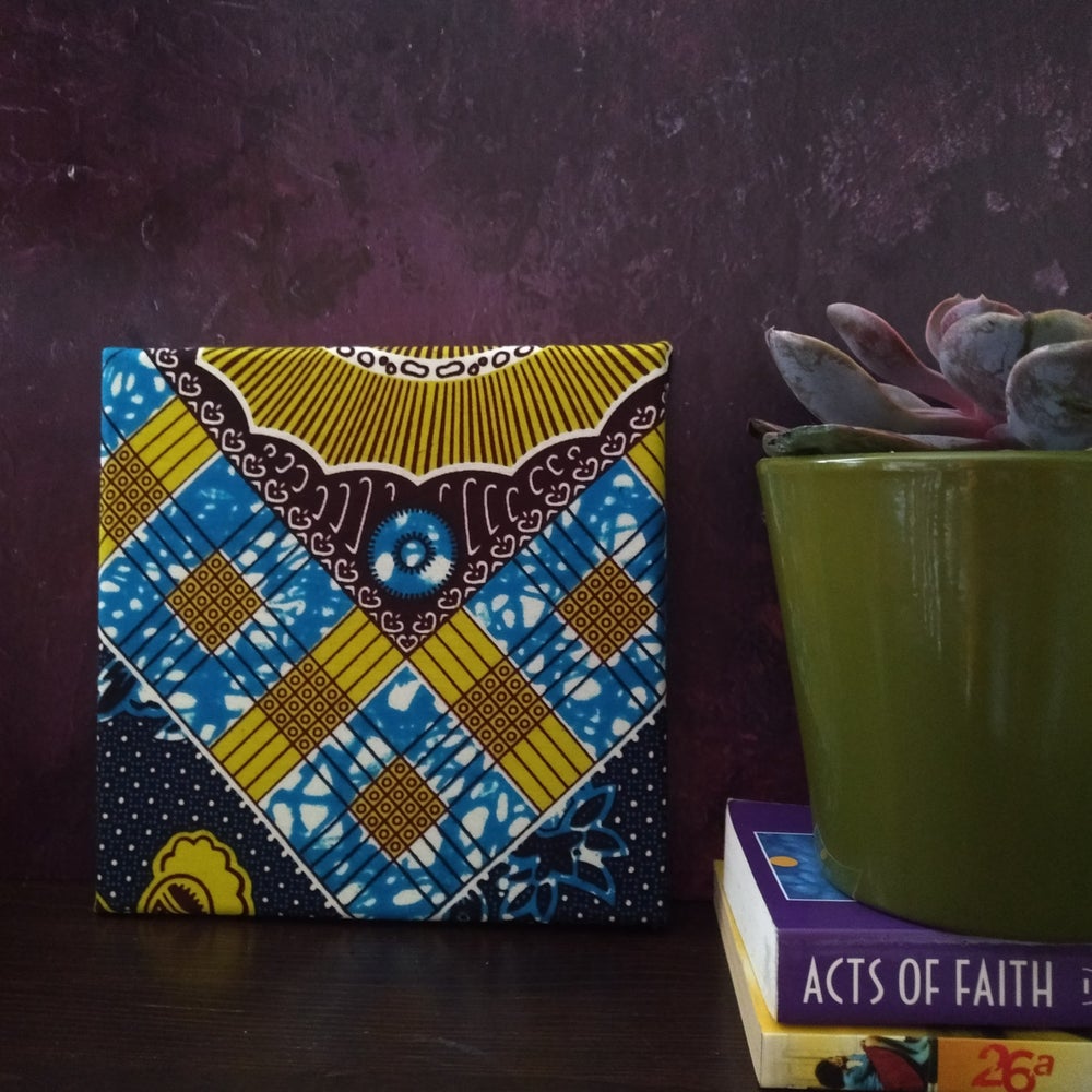 A cool patchwork wall canvas in a mustard & turquoise blue African wax print fabric. This wall decor can be propped against a shelf or hung on a wall.