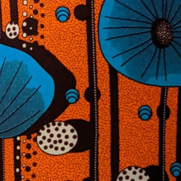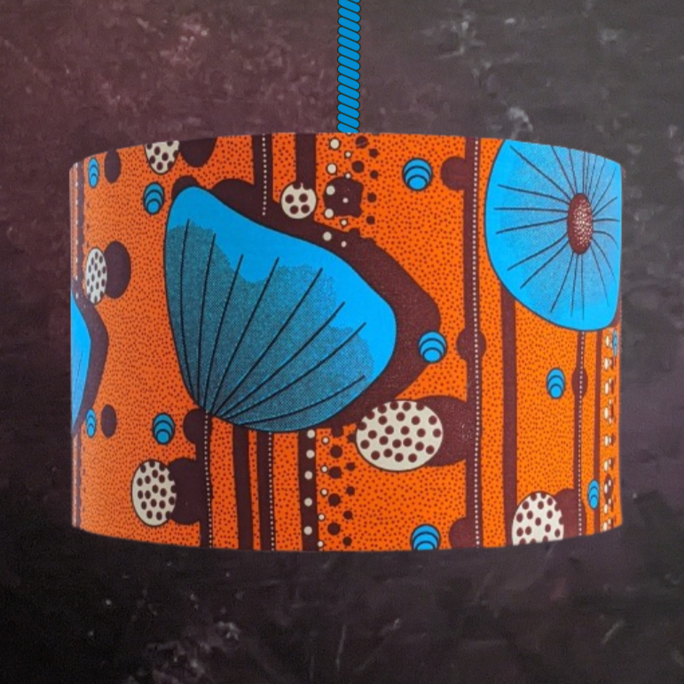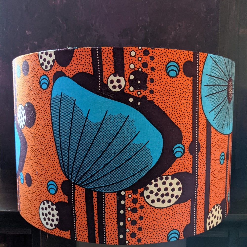 Large orange African wax print drum lampshade with a turquoise blue & brown flower pattern design.