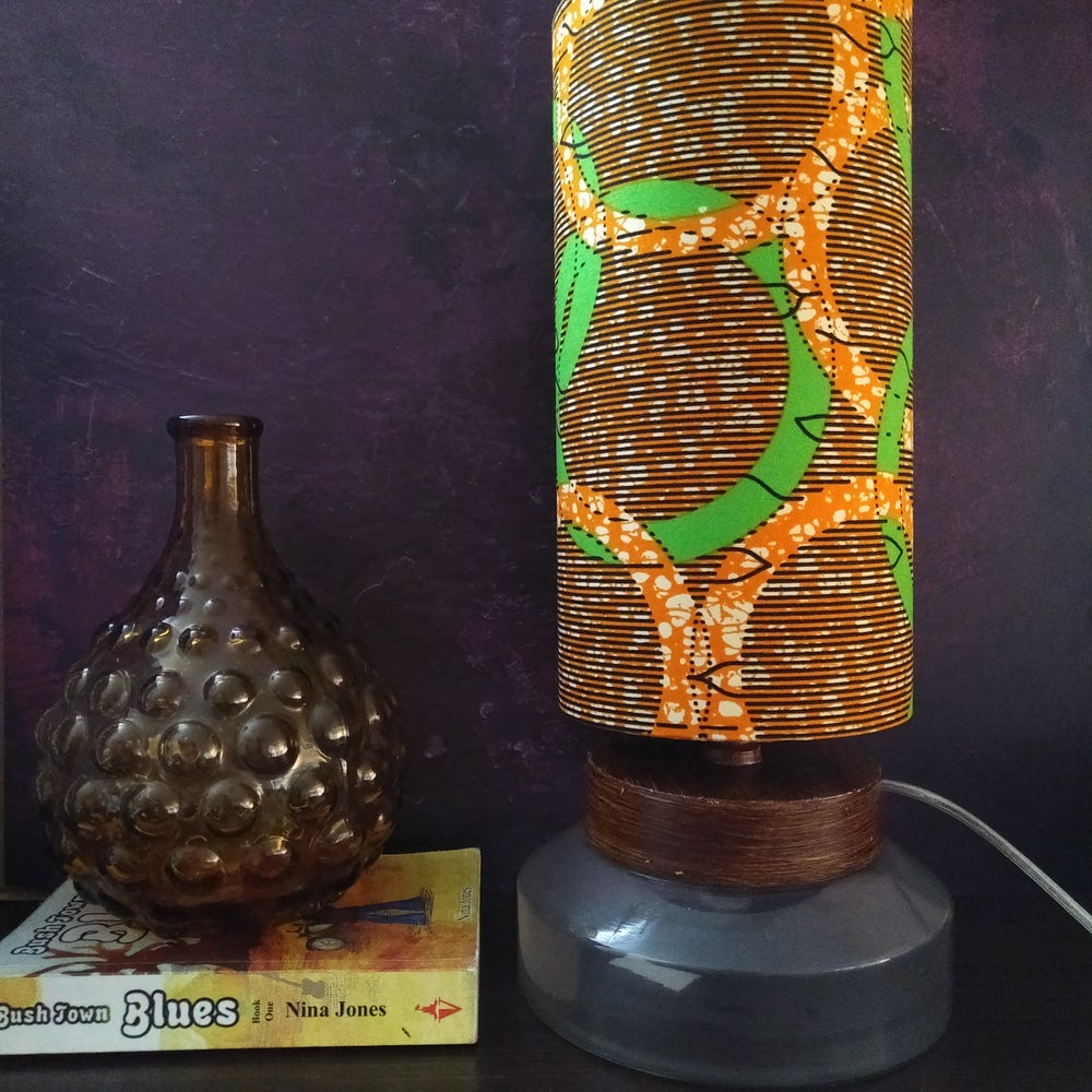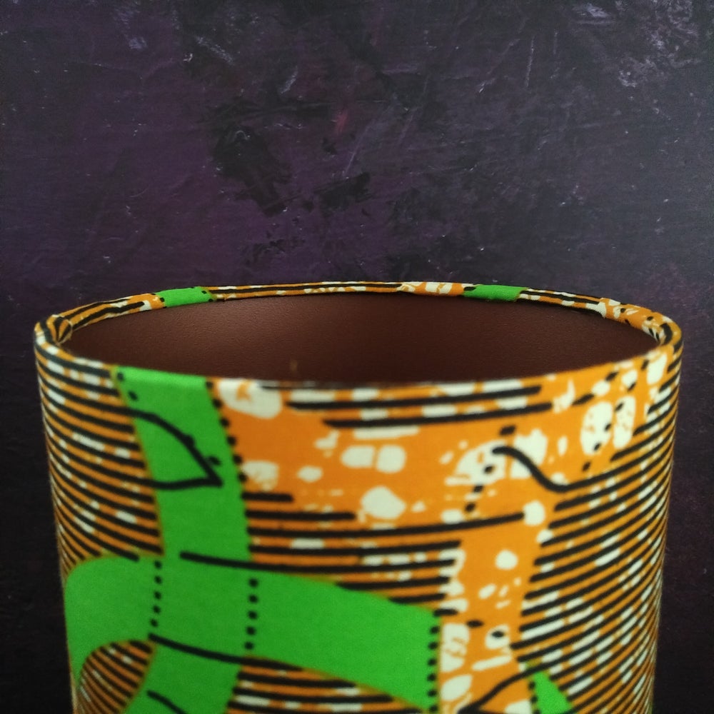 Green & Orange rings tall lampshade made with a bronze African print fabric colourway.