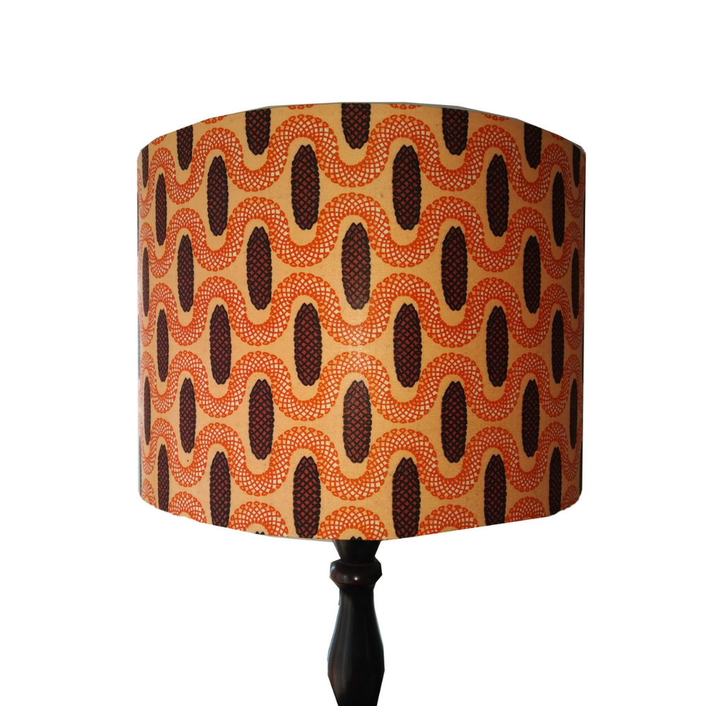 This light orange and brown African drum lampshade is dotted all over with pine cones.
