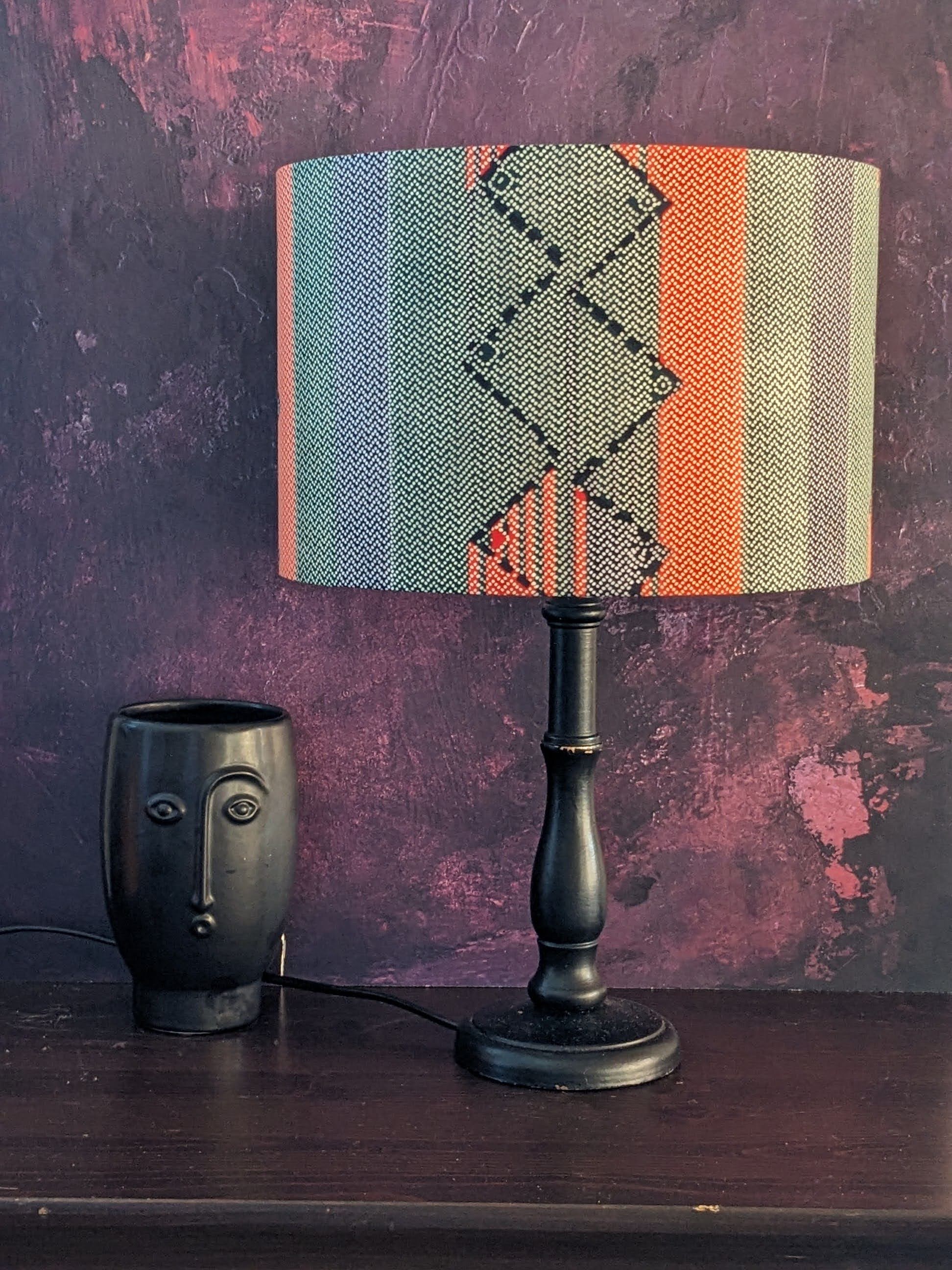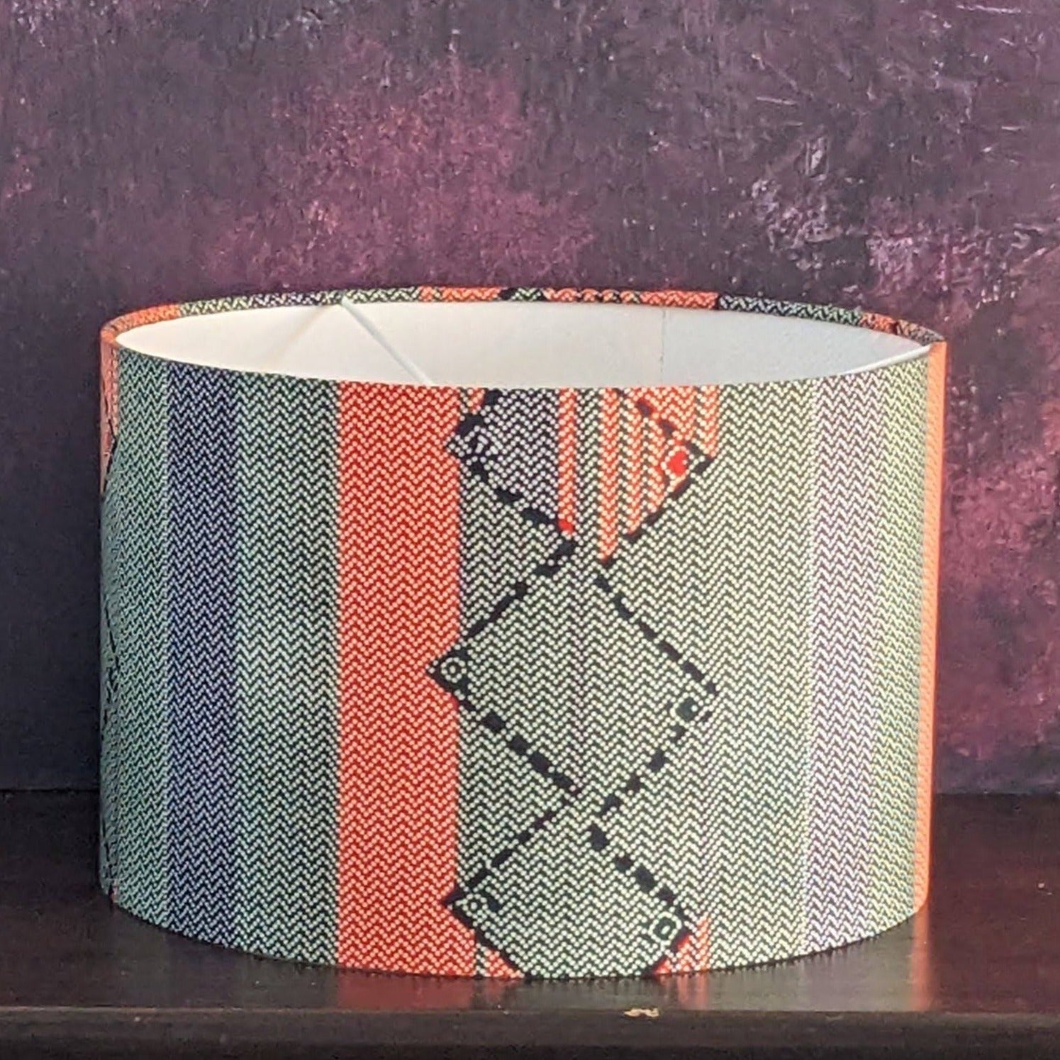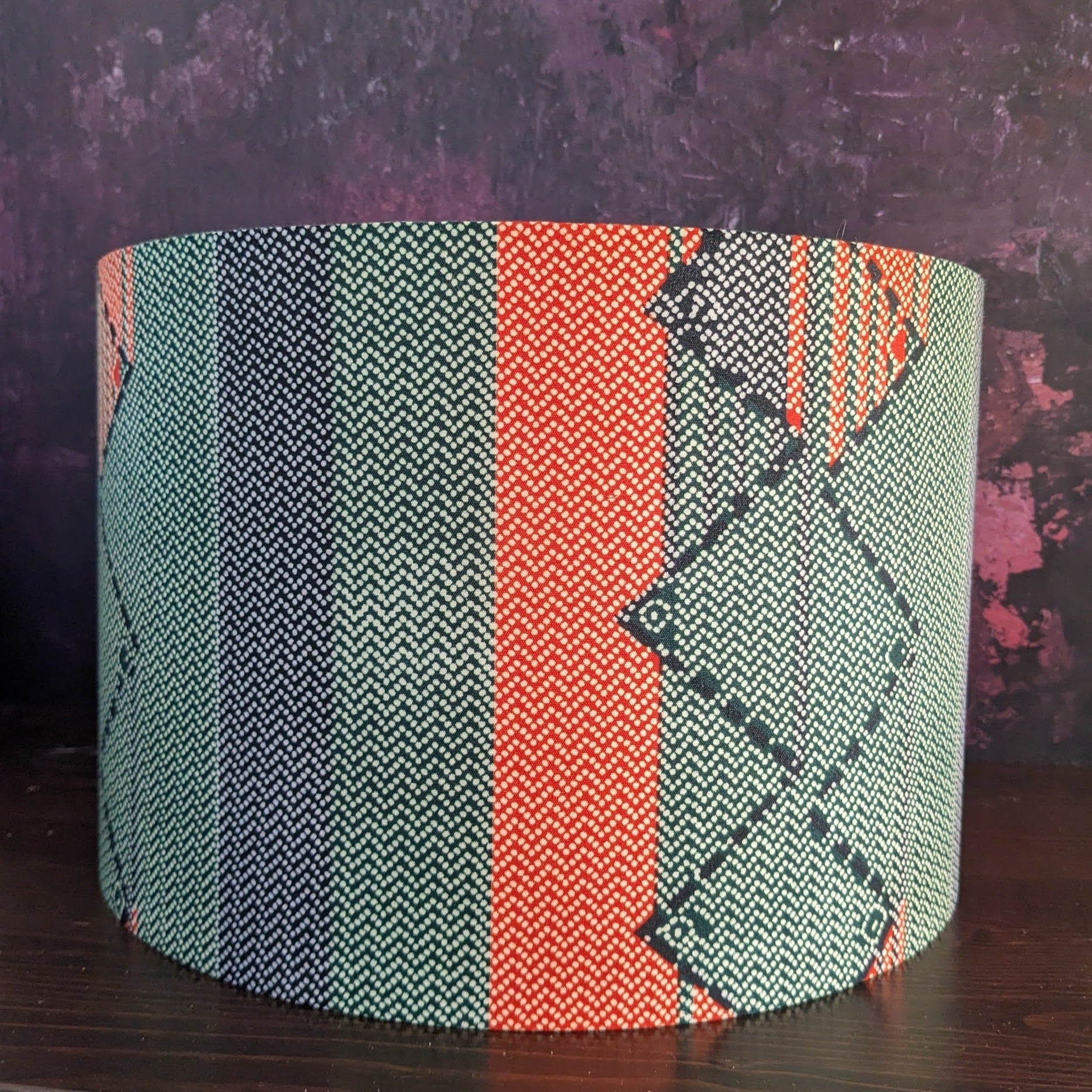 A new African lampshade design in pastel looking colours. It sports bold stripes with small herringbone pattern. It is so Afro Scandi.