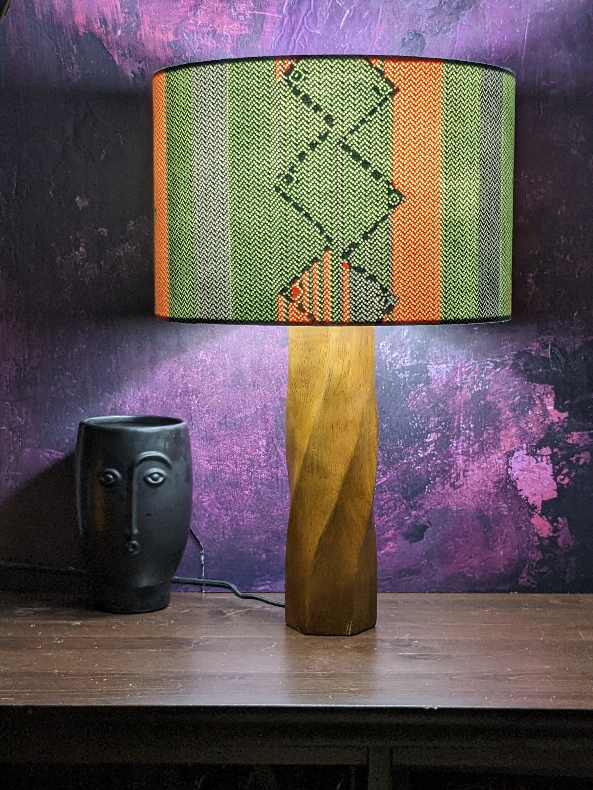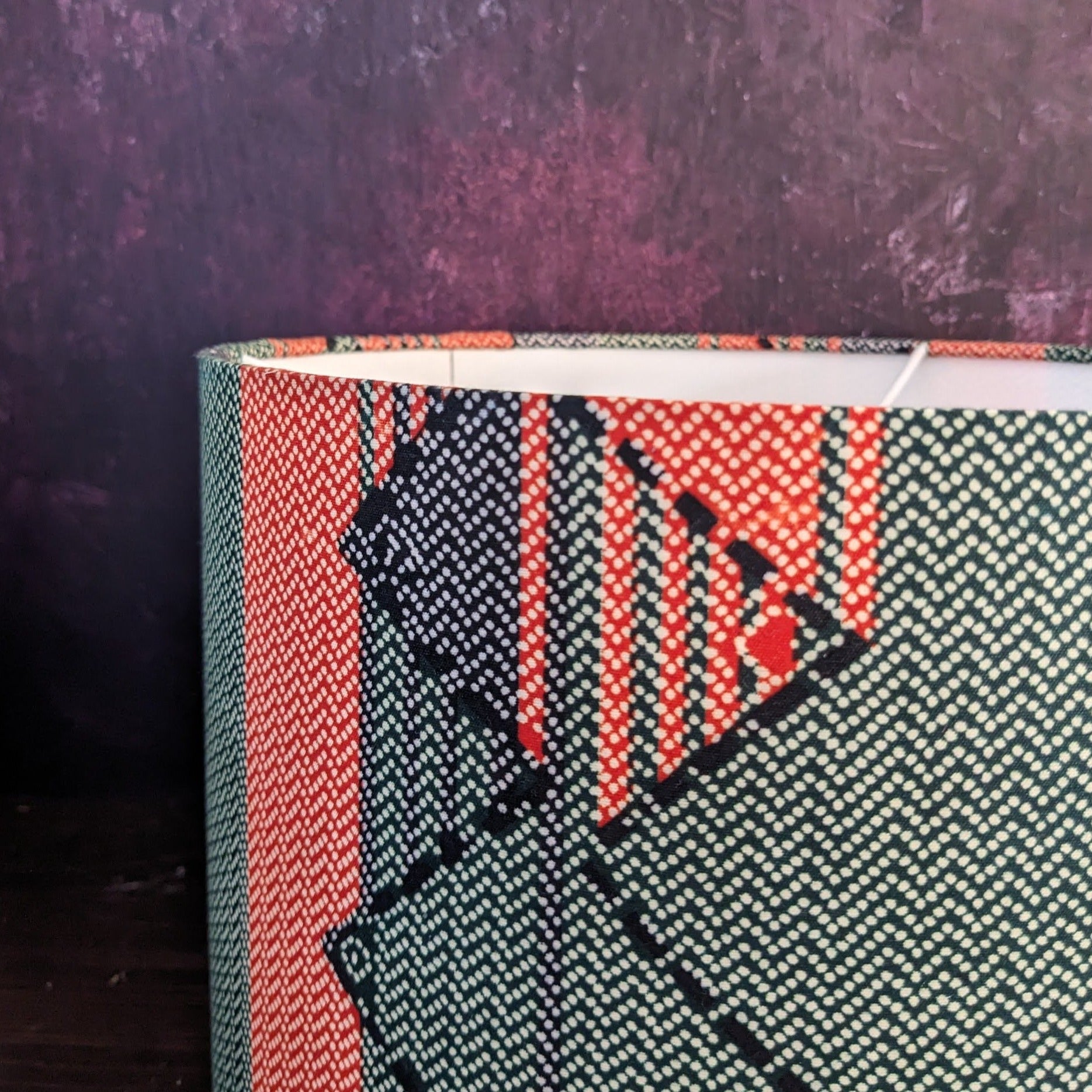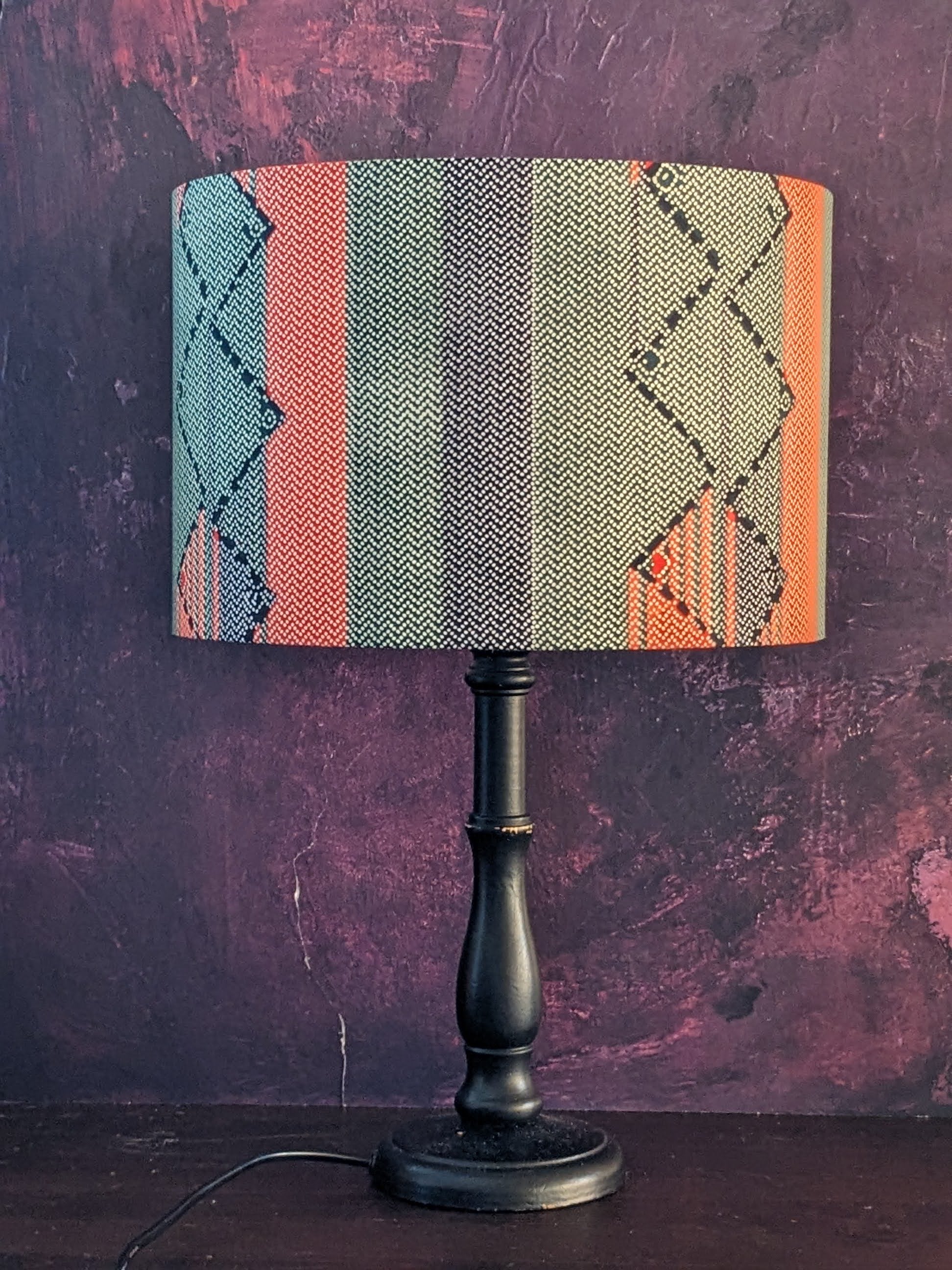 A new African lampshade design in pastel looking colours. It sports bold stripes with small herringbone pattern. It is so Afro Scandi.