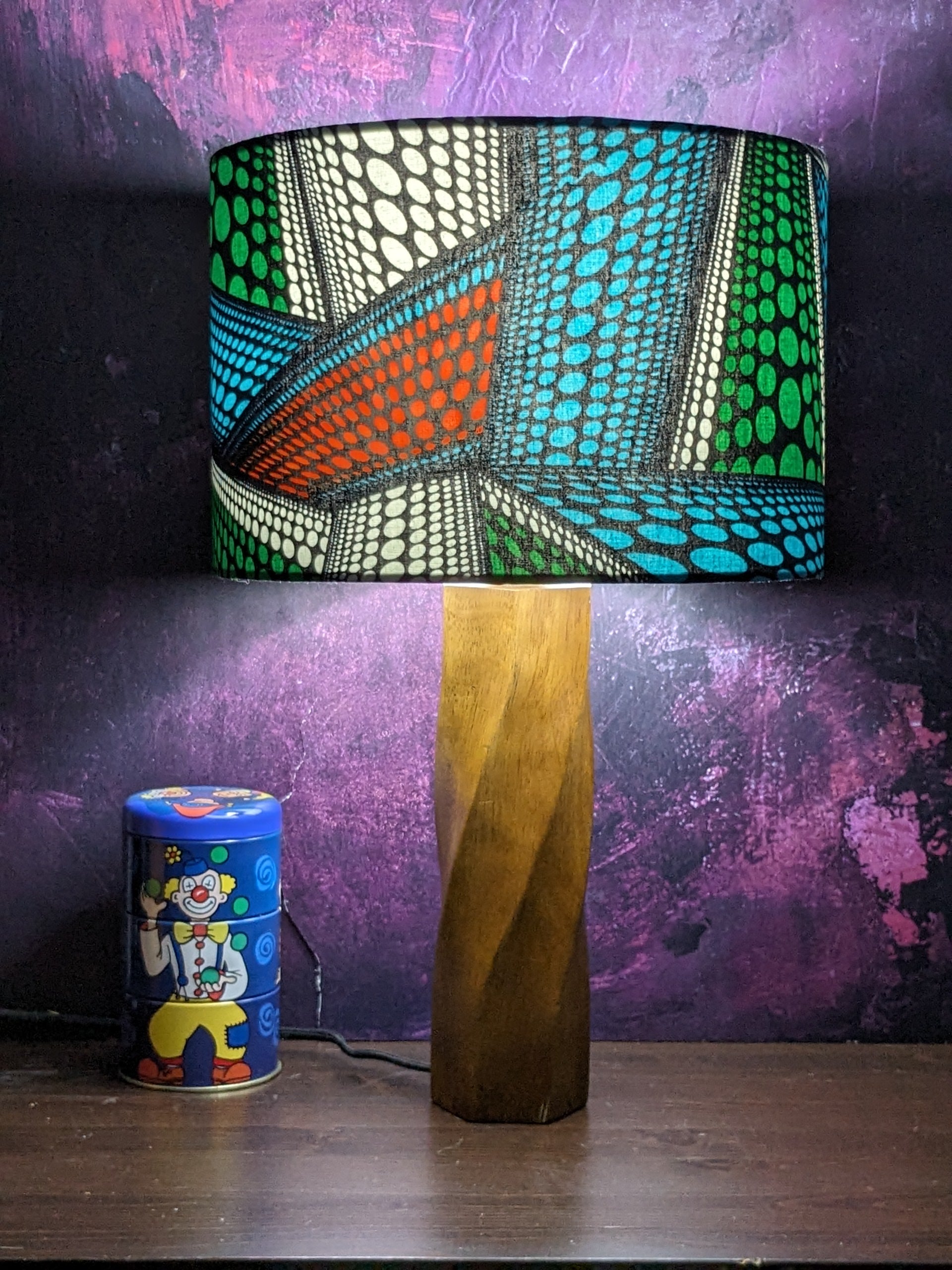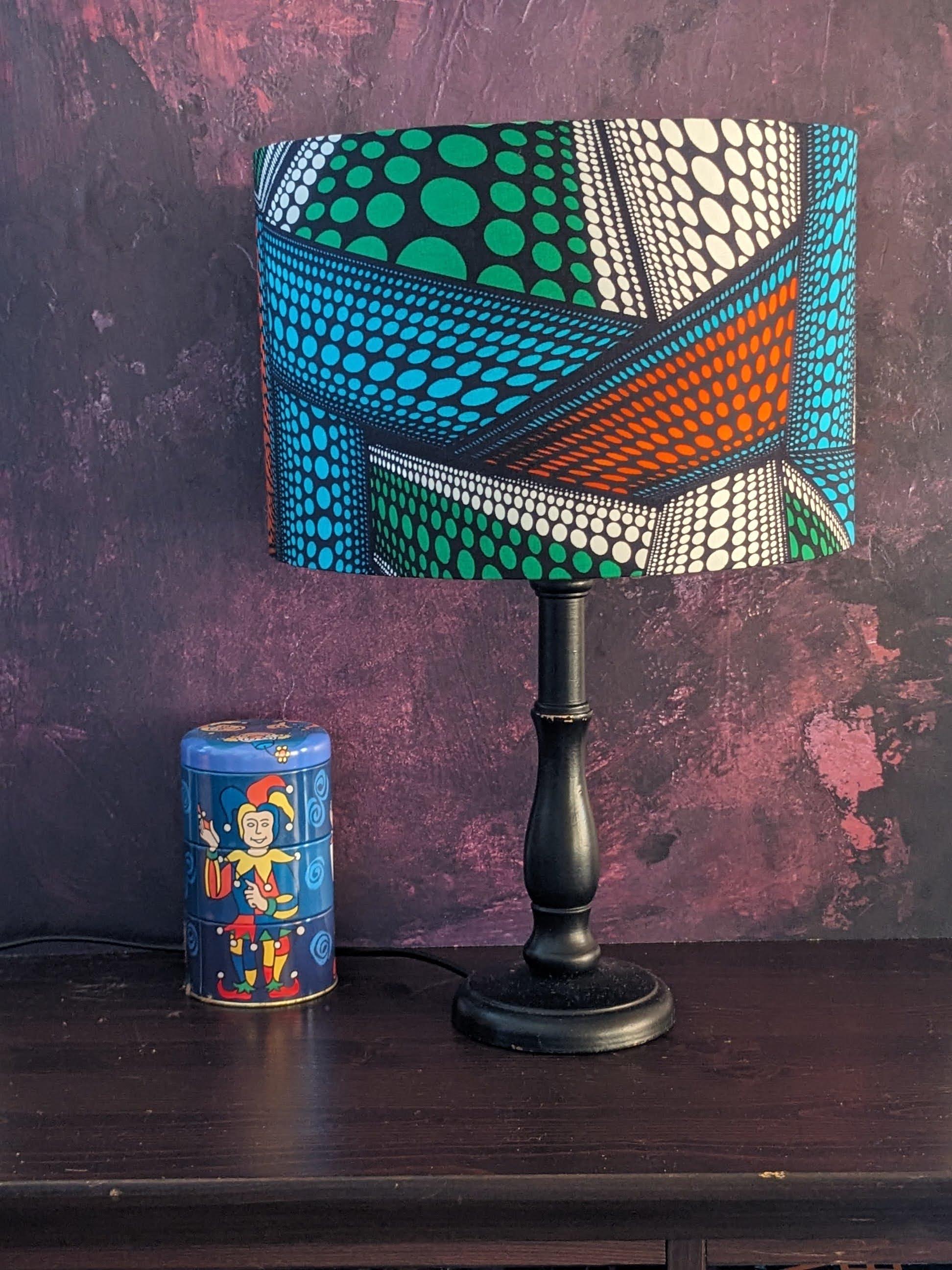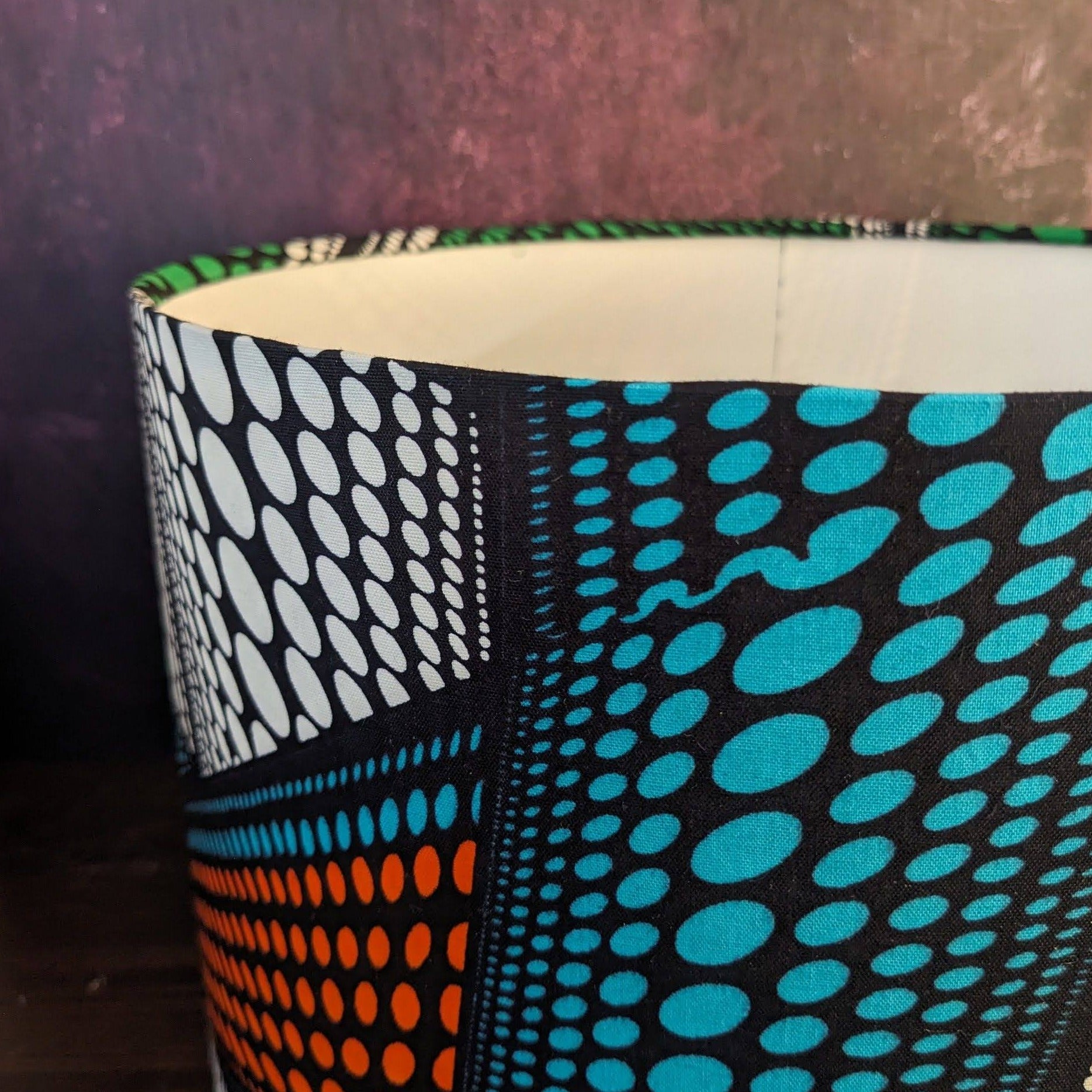 A new bold geometric spots & stripe lampshade design in red green & turqouise colours. Very striking Polka Dots funky patterned lampshade.