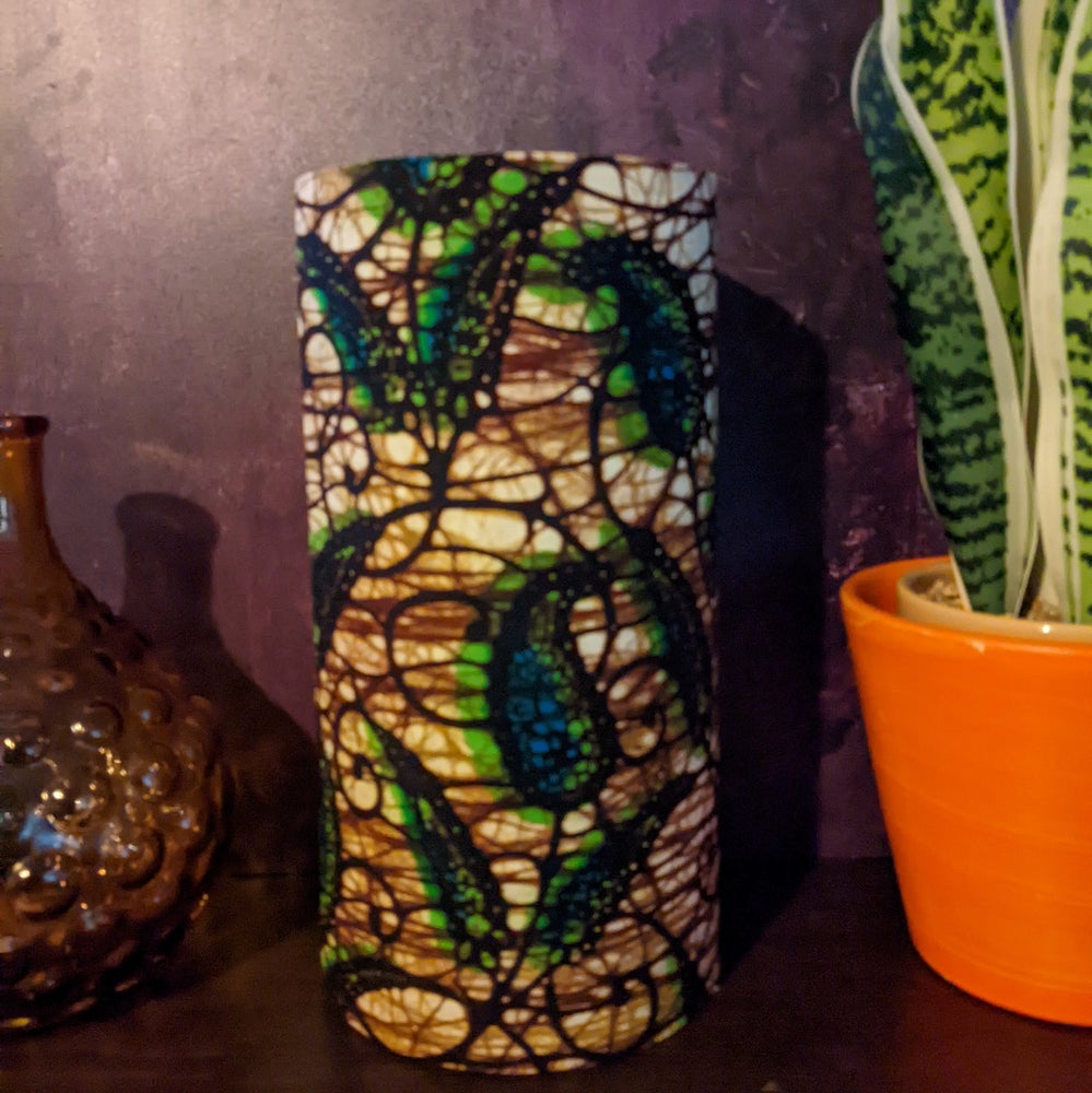A rustic handmade lampshade in a earthy brown & green African print fabric colourway.