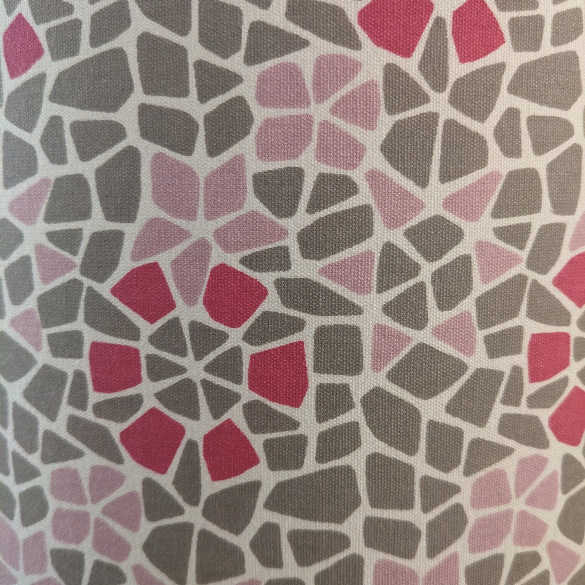 A retro midcentury modern abstract geometric lampshade handmade in a pastel pink & grey cotton fabric.