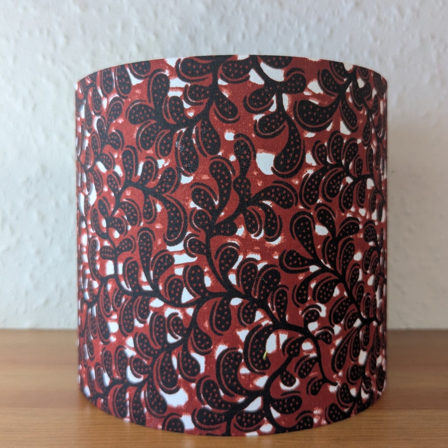 A beautiful reddish brown lampshade patterned with small black leaves all over.