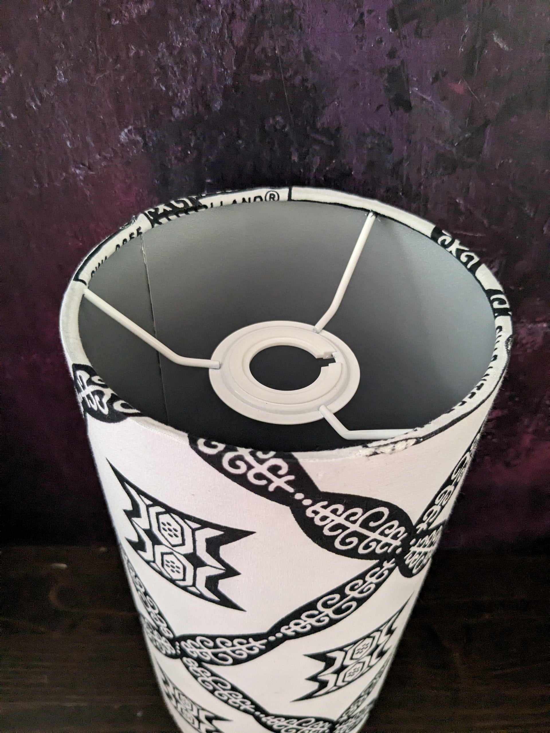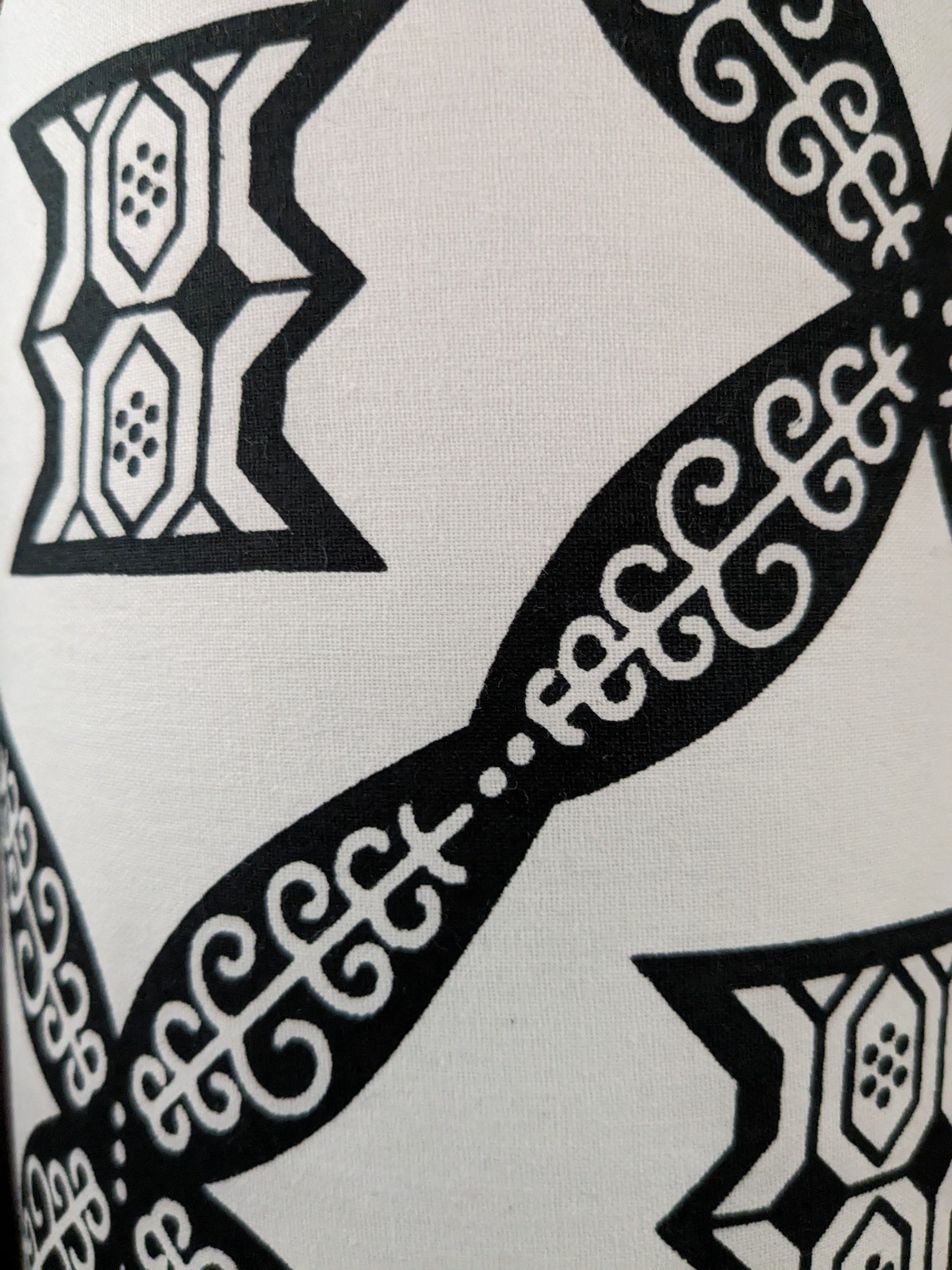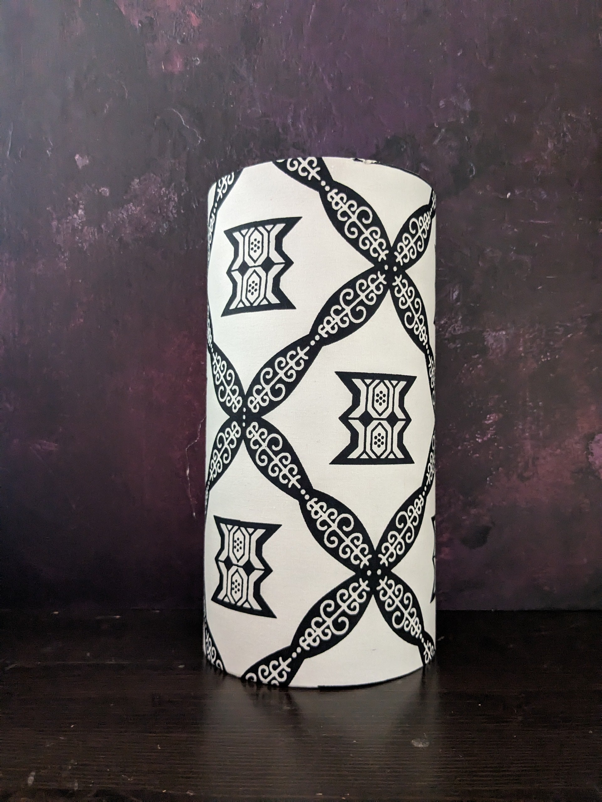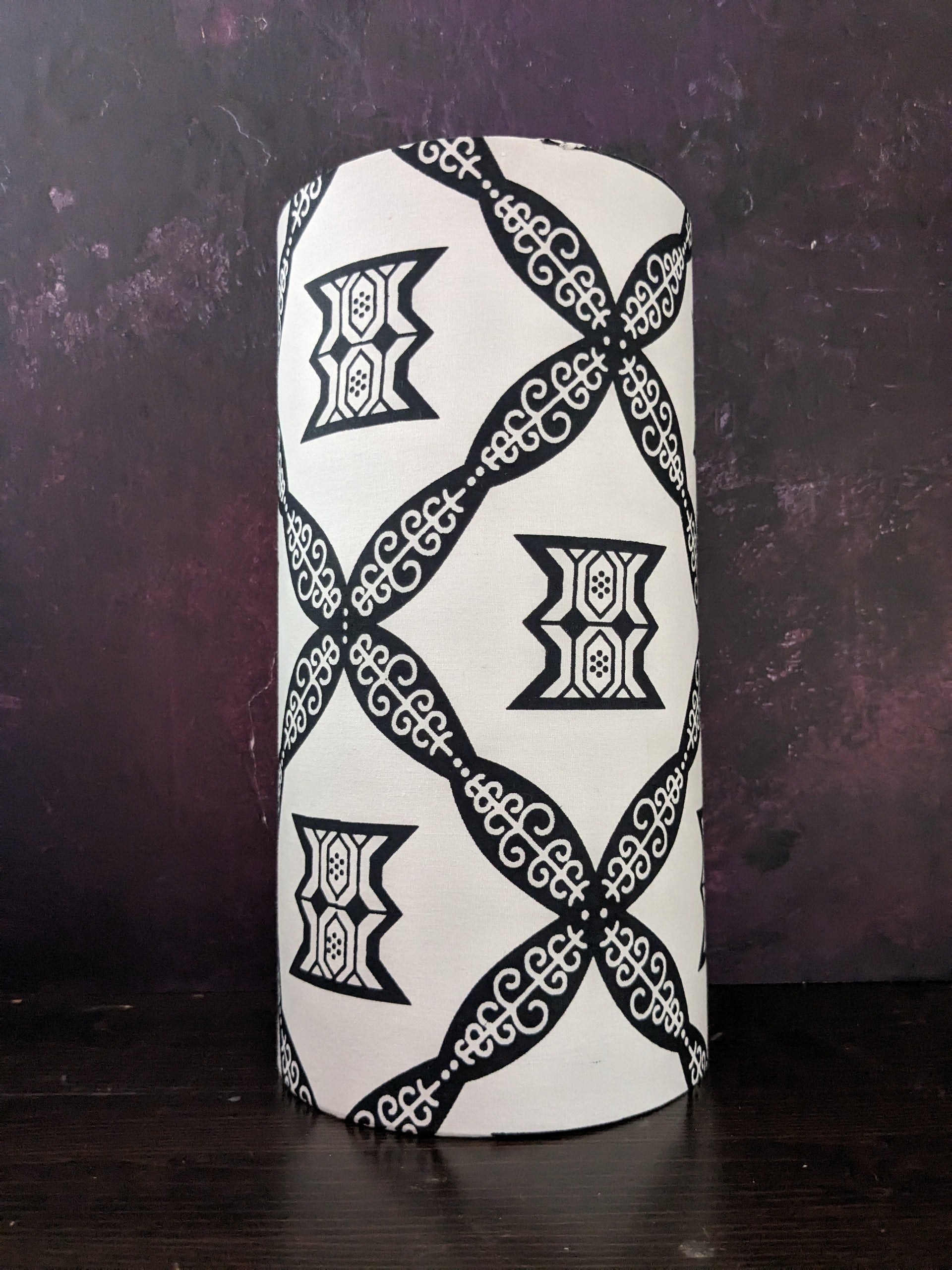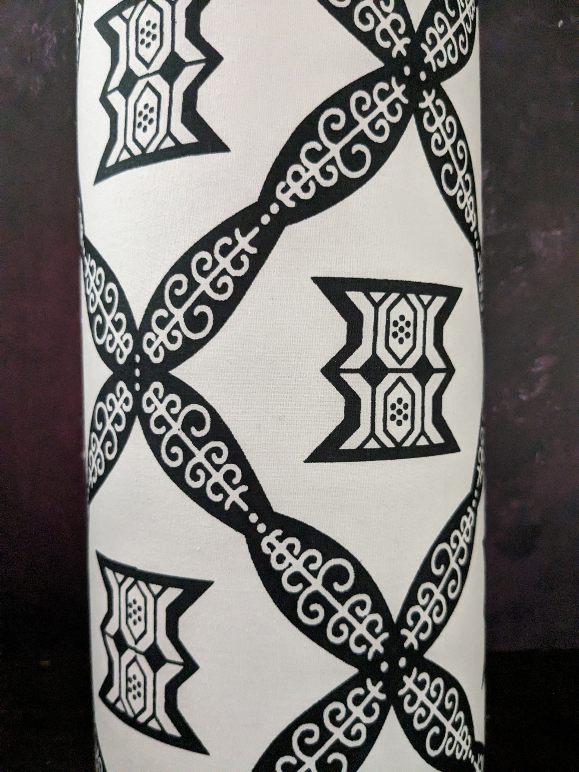 A cool white and black tall drum lampshade patterned with a Ghanaian Adinkra symbol.