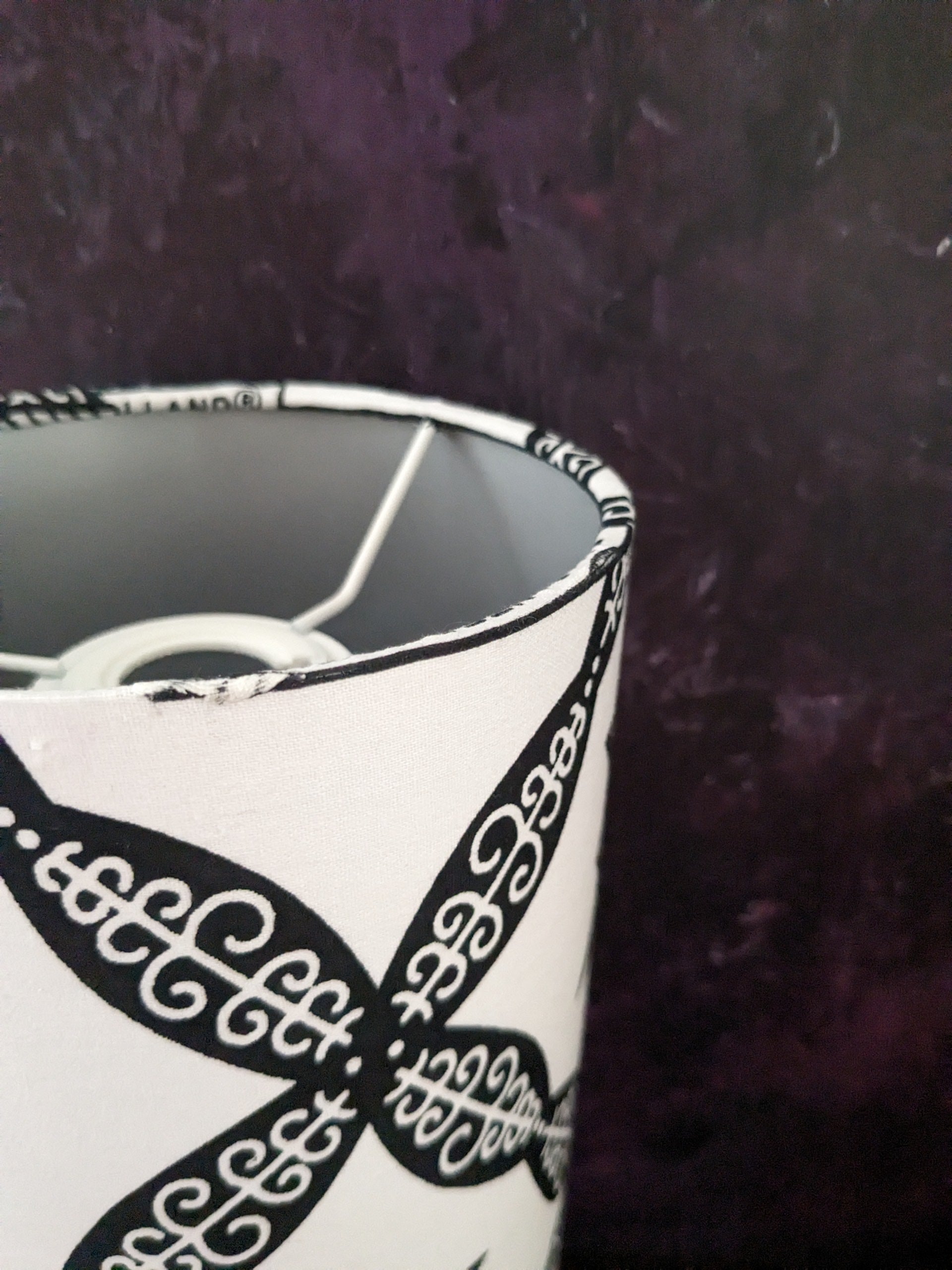 My lampshades are made by hand and lined with flame-retardant PVC backing that has passed the Lighting Association's Glow wire test. Comes with a 40mm standard European light fitting and a 25mm removable UK ring adaptor.