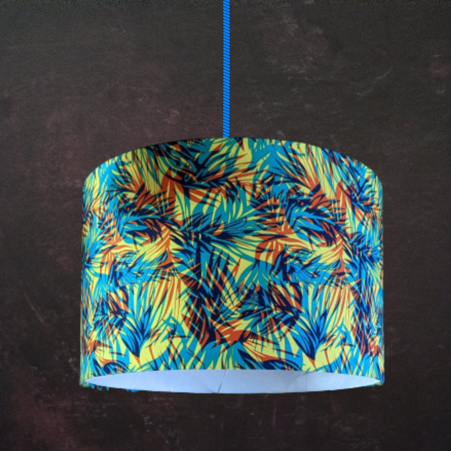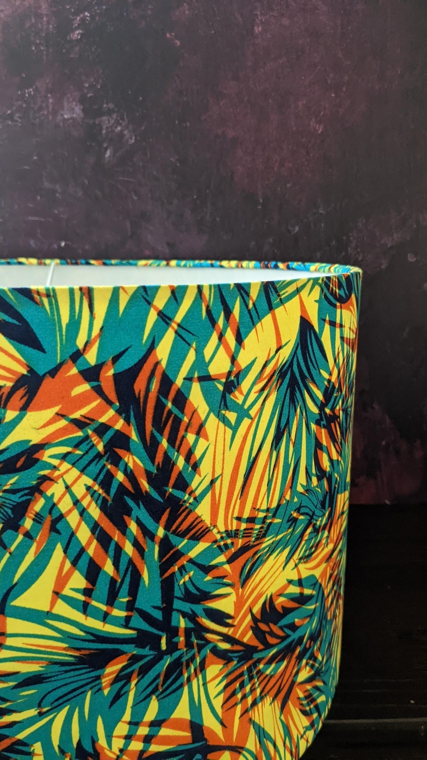 Vibrant patterned lampshade in a colourful tropical palm tree leaf design.