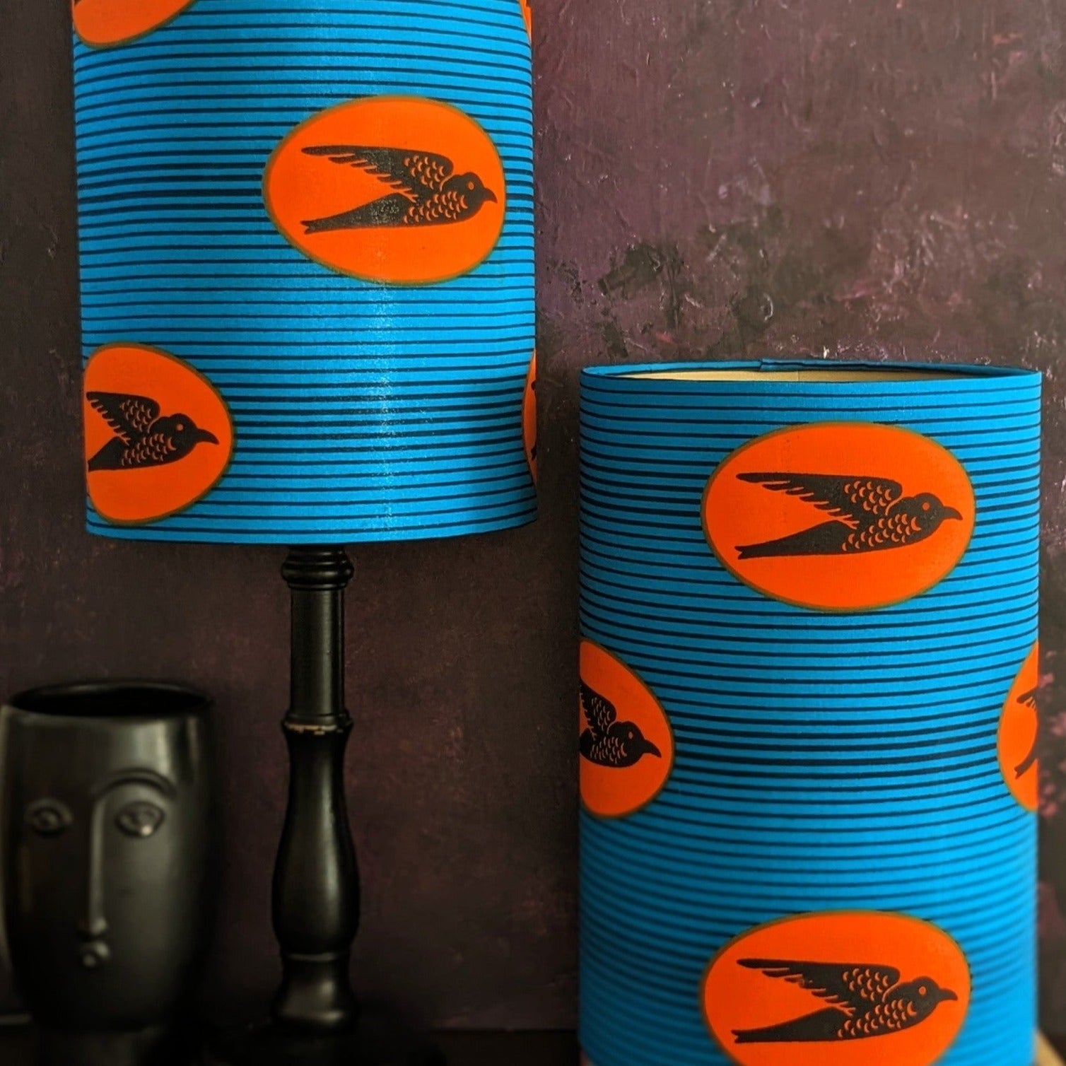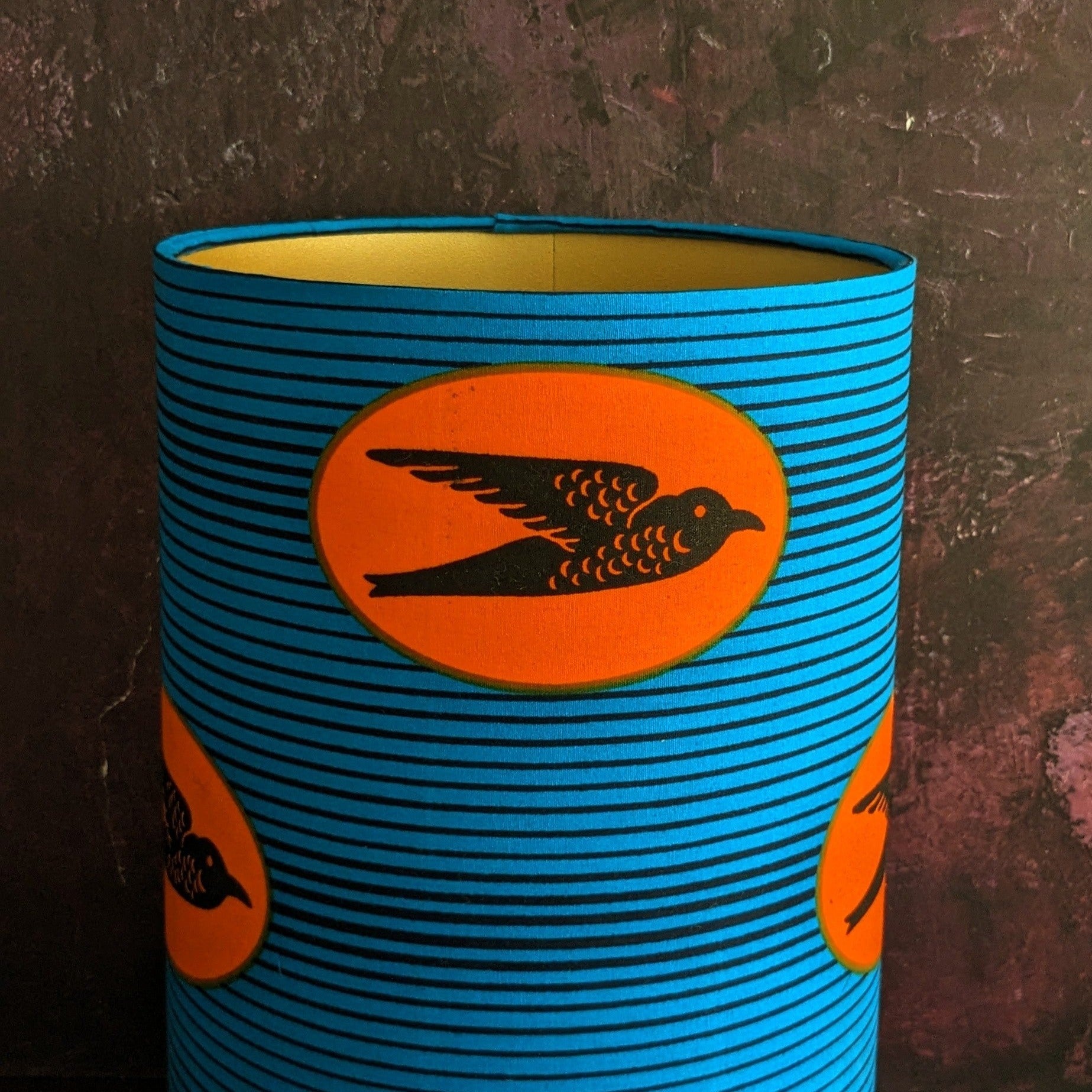 Pair of vibrant bird tube lampshades made with a beautiful swallow African wax print fabric.